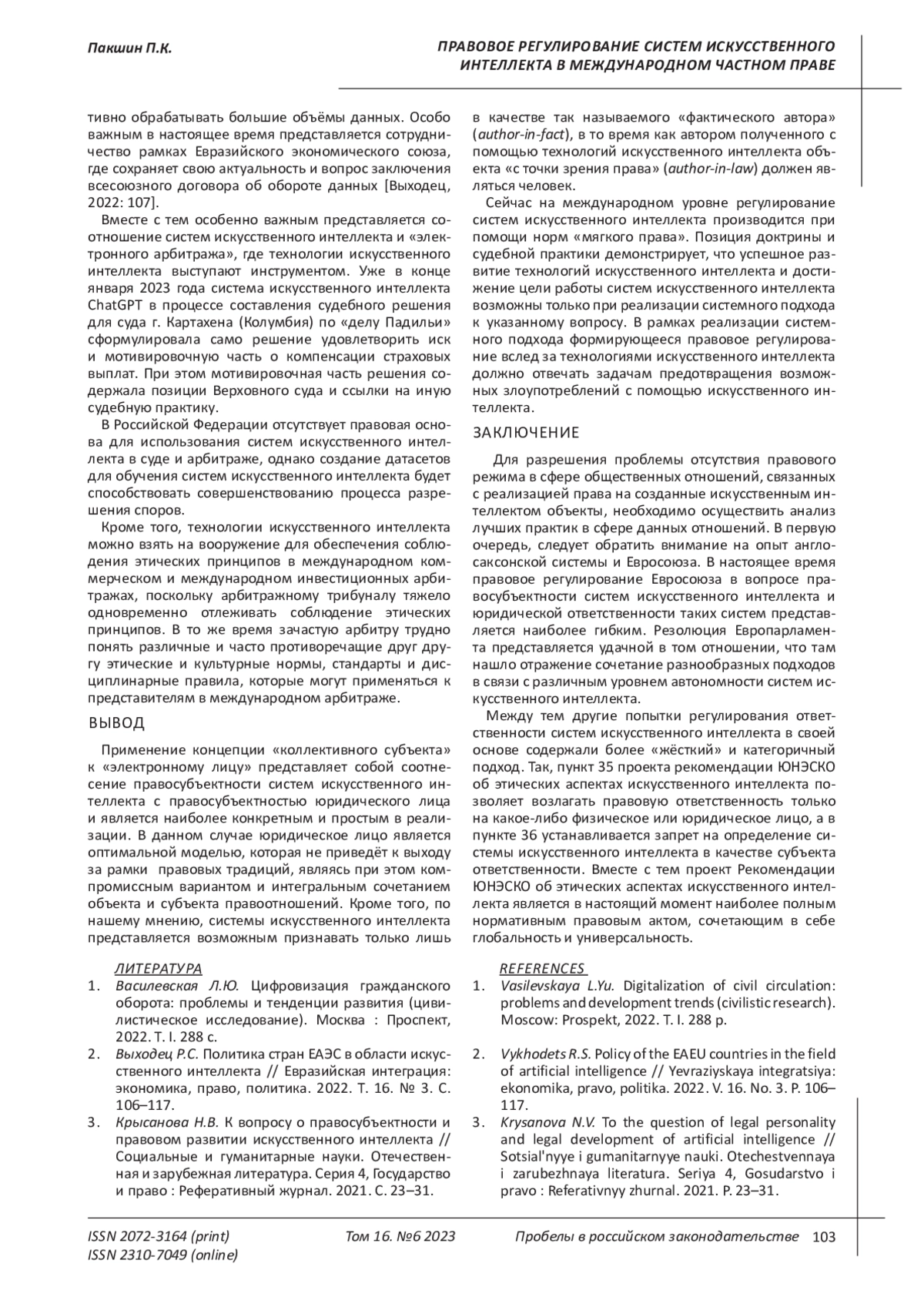 3. 	Крысанова Н.В. К вопросу о правосубъектности и правовом развитии искусственного интеллекта // Социальные и гуманитарные науки. Отечественная и зарубежная литература. Серия 4, Государство и право: Реферативный журнал. 2021. C. 23-31. EDN: XELYYK
