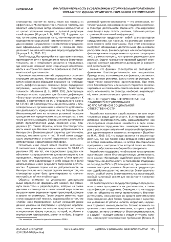 Российские компании задействованы во всех перечисленных видах деятельности. В литературе корпоративная благотворительность рассматривается как своеобразный социальный «симбиоз» в виде «взаимовыгодного сотрудничества… заинтересованных сторон в реализации актуальной социальной программы для удовлетворения взаимных интересов» [Горяйнова Н. М., 2016: 14], что представляется не вполне корректным, так как такого рода сотрудничество далеко не всегда «взаимовыгодно», не всегда это социальная программа», «актуальность» которой также не обязательна, а обусловлена выбором благотворителя. Российское государство не обязывает коммерческие организации вести благотворительную деятельность, но в рамках «Концепции содействия развитию благотворительной деятельности в Российской Федерации на период до 2025 г.» [9] поощряет её, признавая «значимым фактором развития общества» и предусматривая содействие развитию институтов благотворительности, особый статус благотворительных организаций, особый налоговый режим для них (в части пожертвований) и др.