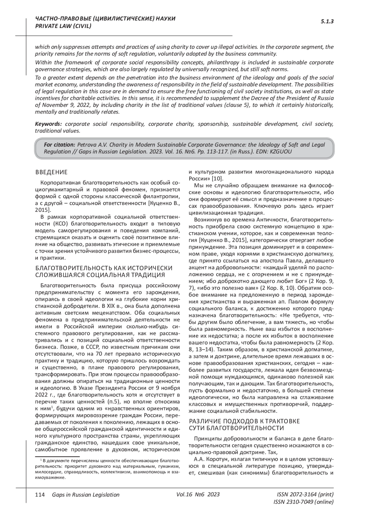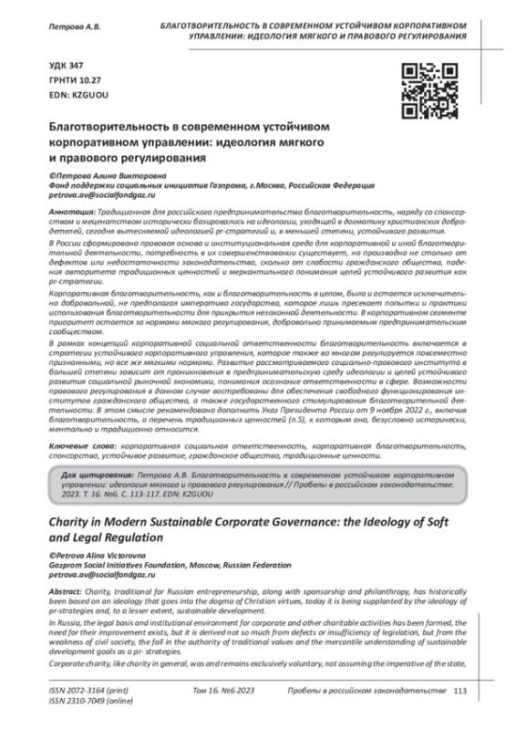 Традиционная для российского предпринимательства благотворительность, наряду со спонсорством и меценатством исторически базировались на идеологии, уходящей в догматику христианских добродетелей, сегодня вытесняемой идеологией pr-стратегий и, в меньшей степени, устойчивого развития. В России сформирована правовая основа и институциональная среда для корпоративной и иной благотворительной деятельности, потребность в их совершенствовании существует, но производна не столько от дефектов или недостаточности законодательства, сколько от слабости гражданского общества, падения авторитета традиционных ценностей и меркантильного понимания целей устойчивого развития как pr-стратегии. Корпоративная благотворительность, как и благотворительность в целом, была и остается исключительно добровольной, не предполагая императива государства, которое лишь пресекает попытки и практики использования благотворительности для прикрытия незаконной деятельности. В корпоративном сегменте приоритет остается за нормами мягкого регулирования, добровольно принимаемым предпринимательским сообществом. В рамках концепций корпоративной социальной ответственности благотворительность включается в стратегии устойчивого корпоративного управления, которое также во многом регулируется повсеместно признанными, но все же мягкими нормами. Развитие рассматриваемого социально-правового института в большей степени зависит от проникновения в предпринимательскую среду идеологии и целей устойчивого развития социальной рыночной экономики, понимания осознание ответственности в сфере. Возможности правового регулирования в данном случае востребованы для обеспечения свободного функционирования институтов гражданского общества, а также государственного стимулирования благотворительной деятельности. В этом смысле рекомендовано дополнить Указ Президента России от 9 ноября 2022 г., включив благотворительность, а перечень традиционных ценностей (п.5), к которым она, безусловно исторически, ментально и традиционно относится.