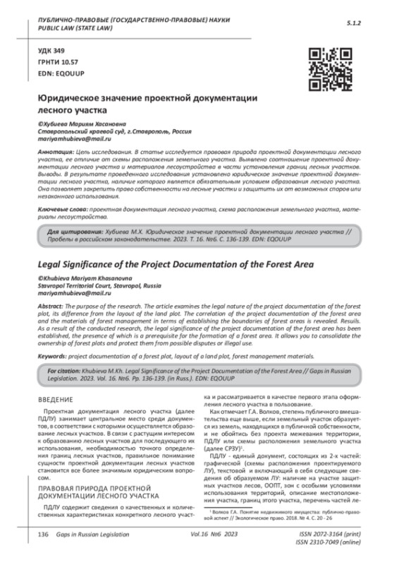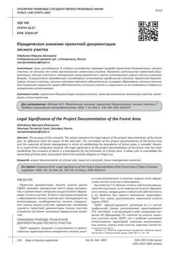 Цель исследования. В статье исследуется правовая природа проектной документации лесного участка, ее отличие от схемы расположения земельного участка. Выявлено соотношение проектной документации лесного участка и материалов лесоустройства в части установления границ лесных участков. Выводы. В результате проведенного исследования установлено юридическое значение проектной документации лесного участка, наличие которого является обязательным условием образования лесного участка. Она позволяет закрепить право собственности на лесные участки и защитить их от возможных споров или незаконного использования.