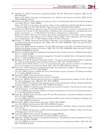 14. Лемешев, М.Я. (2018). Дмитрий Семенович Львов - экономист милостью Божией. Памяти академика Д. С. Львова. Экономическая наука современной России, 2(81), 188-193. EDN: XSVYEH