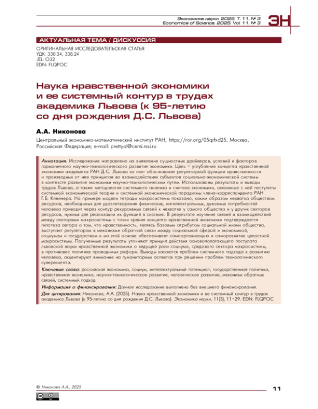 Исследование направлено на выявление сущностных драйверов, условий и факторов гармоничного научно-технологического развития экономики. Цель – углубление концепта нравственной экономики академика РАН Д. С. Львова за счет обоснования регуляторной функции нравственности и производных от нее принципов во взаимодействиях субъектов социально-экономической системы в контексте развития экономики научно-технологическим путем. Использованы результаты и выводы трудов Львова, а также методология системного анализа и синтеза экономики, связанные с ней постулаты системной экономической теории и системной экономической парадигмы члена-корреспондента РАН Г. Б. Клейнера. На примере модели тетрады макросистемы показано, каким образом нехватка обществом ресурсов, необходимых для удовлетворения физических, интеллектуальных, духовных потребностей человека приводит через контур рекурсивных связей к нехватке у самого общества и у других секторов ресурсов, нужных для реализации их функций в системе. В результате изучения связей и взаимодействий между секторами макросистемы с точки зрения концепта нравственной экономики подтверждается гипотеза автора о том, что нравственность, являясь базовым атрибутом социальной жизни общества, выступает регулятором в механизме обратной связи между социальной сферой и экономикой, социумом и государством и на этой основе обеспечивает самоорганизацию и саморазвитие целостной макросистемы. Полученные результаты уточняют принцип действия основополагающего постулата львовской науки нравственной экономики о ведущей роли социума, средового сектора макросистемы, в противовес политике проводимых реформ. Выводы касаются проблем системного подхода к развитию человека, акцентируют внимание на гуманитарных аспектах при решении проблем технологического суверенитета.