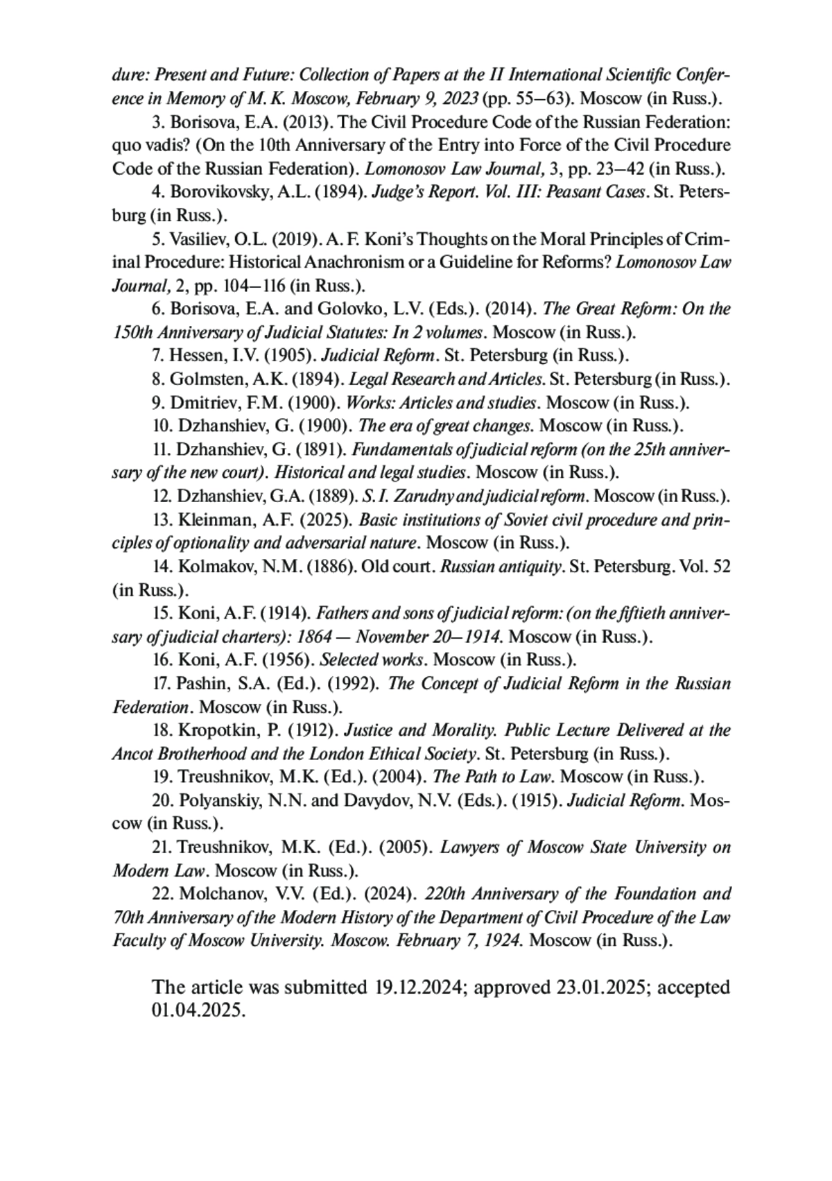 13. 	Клейнман А. Ф. Основные институты советского гражданского процесса и принципы диспозитивности и состязательности. М., 2025.