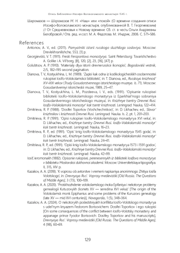 27. Шаромазов М. Н. “Наш” или “покой” (О времени создания описи Иосифо-Волоколамского монастыря, опубликованной В. Т. Георгиевским) // От Средневековья к Новому времени: Сб. ст. в честь Ольги Андреевны Белобровой / Отв. ред. и сост. М. А. Федотова. М.: Индрик, 2006. С. 571-586.