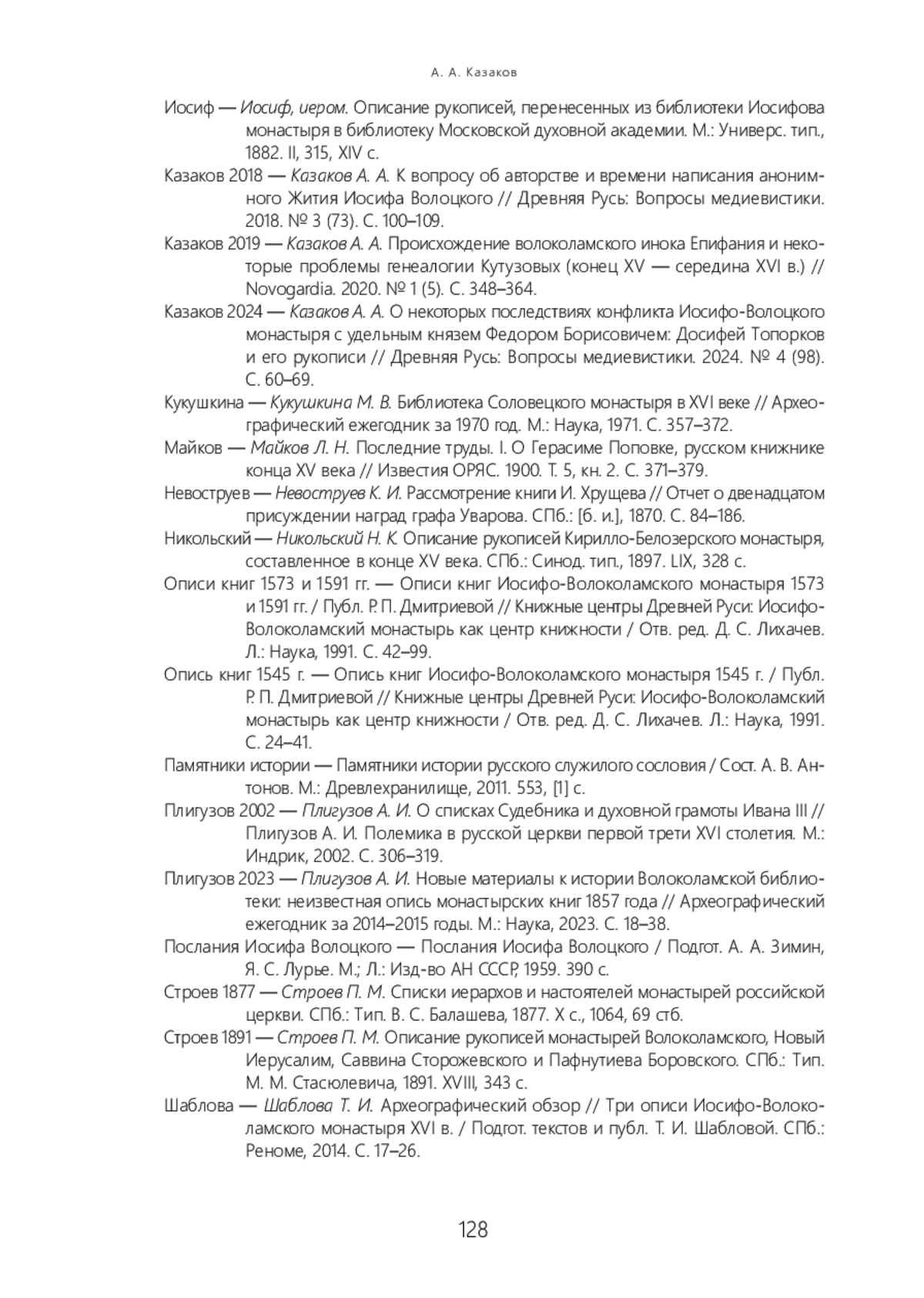 22. Плигузов А. И. Новые материалы к истории Волоколамской библиотеки: неизвестная опись монастырских книг 1857 года // Археографический ежегодник за 2014-2015 годы. М.: Наука, 2023. С. 18-38.