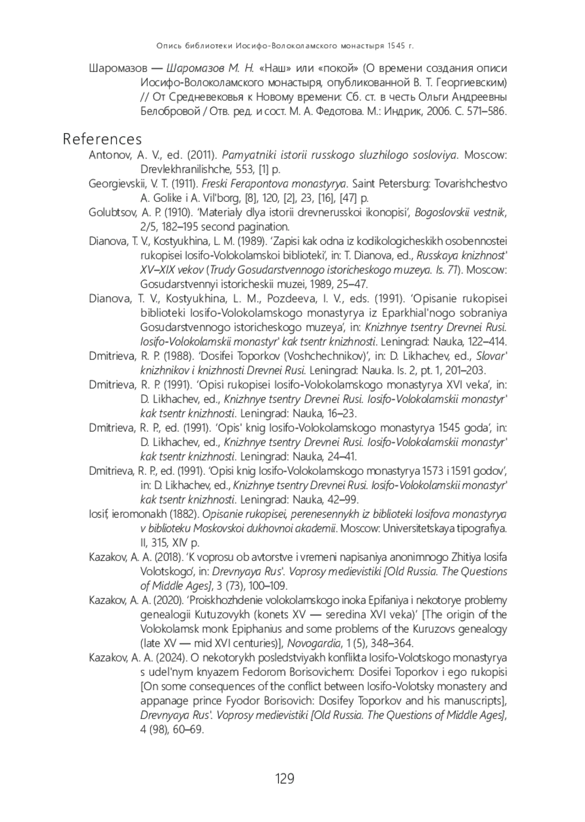 13. Казаков А. А. О некоторых последствиях конфликта Иосифо-Волоцкого монастыря с удельным князем Федором Борисовичем: Досифей Топорков и его рукописи // Древняя Русь: Вопросы медиевистики. 2024. № 4 (98). С. 60-69.