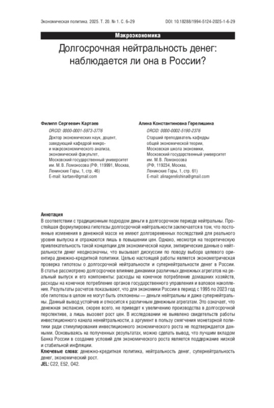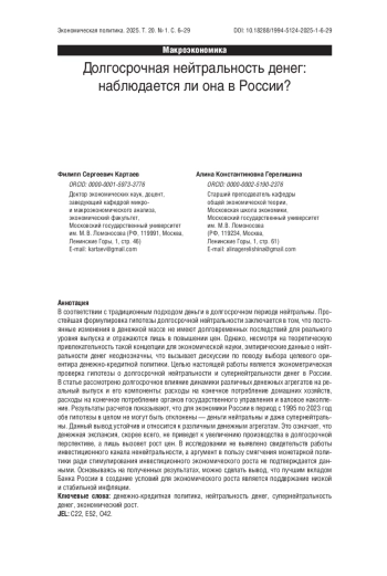 26. Serletis A., Krause D. Empirical Evidence on the Long-Run Neutrality Hypothesis Using Low-Frequency International Data //Economics Letters. 1996. Vol. 50(3). P. 323-327. https://doi.org/10.2307/2601265.