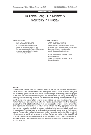 12. Coe P.J., Nason J.M. The Long-Horizon Regression Approach to Monetary Neutrality: How Should the Evidence Be Interpreted?//Economics Letters. 2003. Vol. 78(3). P. 351-356. https://doi.org/10.1016/S0165-1765(02)00263-X.