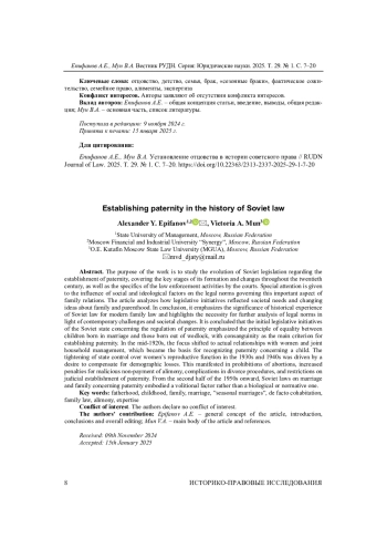 Цель работы - исследование эволюции советского законодательства об установлении отцовства, охватывающее ключевые этапы его формирования и изменения на протяжении XX в., а также особенности правоприменительной деятельности судов. Особое внимание уделяется влиянию социальных и идеологических факторов на правовые нормы, регулирующие этот важный аспект семейных отношений. Анализируется, как законодательные инициативы отражали потребности общества и изменяющиеся представления о семье и родительстве. В заключении подчеркивается значение исторического опыта советского права для современного семейного законодательства, а также необходимость дальнейшего анализа правовых норм в контексте современных вызовов и изменений в обществе. Сформулирован вывод о том, что первые законодательные инициативы Советского государства, касающиеся регулирования института отцовства, подчеркивали принцип равенства между детьми, рожденными в браке, и теми, кто появился на свет вне брака, при этом основным критерием для установления отцовства было кровное родство. В середине 1920-х гг. акцент сместился на фактические отношения с женщиной и совместное ведение хозяйства, что стало основанием для признания отцовства в отношении ребенка. Ужесточение контроля государства над репродуктивной функцией женщин в 1930-1940-е гг. было вызвано стремлением восполнить демографические потери и выражалось в запрете абортов, усилении ответственности за злостный неплатеж алиментов, усложнении процедуры развода, запрете судебного установления отцовства. Начиная со второй половины 1950-х гг. советские законы о браке и семье в вопросах установления отцовства воплощали идею волевого фактора взамен биологического или нормативного.