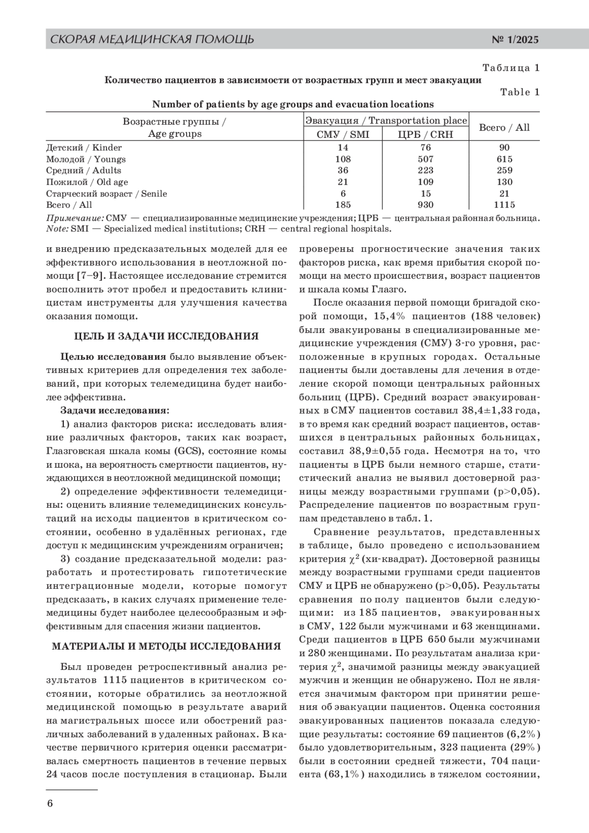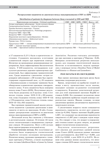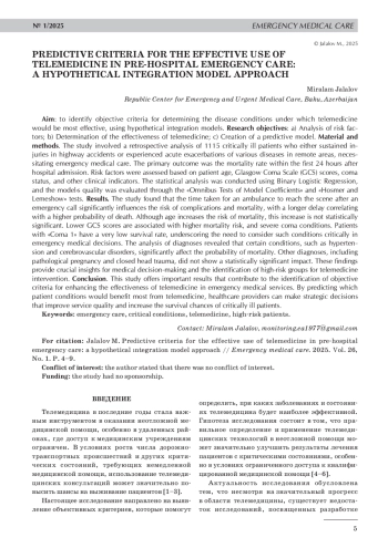 Цель: выявление объективных критериев для определения тех заболеваний, при которых телемедицина будет наиболее эффективна. Задачи исследования: 1) анализ факторов риска; 2) определение эффективности телемедицины; 3) создание предсказательной модели. Материалы и методы. В исследовании проведен ретроспективный анализ 1115 пациентов в критическом состоянии, которые получили травмы в результате аварий на автомагистралях и с обострениями различных заболеваний в удаленных районах, требующие неотложной медицинской помощи. Основным фактором было определение вероятности смертности в первые 24 часа после поступления в стационар. Оценивались такие факторы риска, как возраст пациентов, баллы по шкале комы Глазго (GCS), состояние комы и другие клинические показатели. Статистический анализ был проведен с использованием бинарной логистической регрессии, а качество модели было оценено с помощью тестов «Omnibus Tests of Model Coefficients» и «Hosmer and Lemeshow». Результаты. Исследование показало, что время, затраченное на прибытие скорой помощи на место происшествия после вызова, значительно влияет на риск осложнений и смертности; чем дольше задержка, тем выше вероятность смерти. Хотя возраст увеличивает риск смертности, это увеличение статистически незначительно. Низкие баллы по шкале комы Глазго (GCS) ассоциируются с повышенным риском смертности у пациентов с тяжелой комой. Пациенты с «Комой 1» имеют очень низкие шансы на выживание, что подчеркивает необходимость тщательного учета таких состояний при принятии решений об оказании экстренной медицинской помощи. Анализ диагнозов выявил, что определенные состояния, такие как гипертензия и нарушения мозгового кровообращения, значительно влияют на вероятность смертности. Другие диагнозы, такие как патологическая беременность и закрытая черепно-мозговая травма, не показали статистически значимого влияния. Эти результаты предоставляют важные данные для принятия медицинских решений и выявления групп высокого риска для телемедицинского вмешательства. Заключение. Данное исследование предлагает важные результаты, которые способствуют определению объективных критериев для повышения эффективности телемедицины в экстренной медицинской помощи. Прогнозируя, при каких условиях пациенты получат наибольшую пользу от телемедицины, медицинские учреждения могут принимать стратегические решения, направленные на улучшение качества услуг и повышение шансов на выживание пациентов в критическом состоянии.