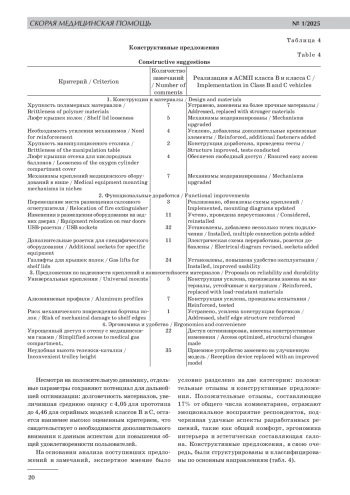 Введение. Потребность в модернизации салонов автомобилей скорой медицинской помощи (СМП) обусловлена необходимостью улучшения их эргономики. Цель исследования: оптимизировать прототип салона автомобиля скорой медицинской помощи на основе обратной связи и рекомендаций экспертного сообщества. Задачи исследования: оценить прототип салона СМП, доработать конструкцию на основе обратной связи, внедрить модификации в серийные модели, провести повторную оценку полученных результатов, в том числе эксплуатационную оценку, и выявить направления для дальнейших улучшений. Материалы и методы. Исследование проводилось в два этапа: на первом этапе было опрошено 255 респондентов, на втором — 245. Применялись методы описательной статистики и критерий Манна–Уитни для оценки статистической значимости различий между показателями прототипа и серийных моделей. Результаты. По итогам анализа: универсальность креплений была улучшена (рост оценки с 4,49 до 4,71), комфорт пациента увеличился с 4,67 до 4,80, а удобство уборки выросло с 4,52 до 4,74; общее число положительных отзывов составило 84%, что подтвердило высокий уровень удовлетворенности медицинского сообщества. Заключение. Интеграция обратной связи медицинского сообщества в процесс проектирования автомобилей СМП позволила создать функциональные и надежные решения, отвечающие современным требованиям и улучшающие условия работы сотрудников бригад СМП. Разработанная методология показала свою эффективность и может быть использована для дальнейшей модернизации санитарного транспорта.