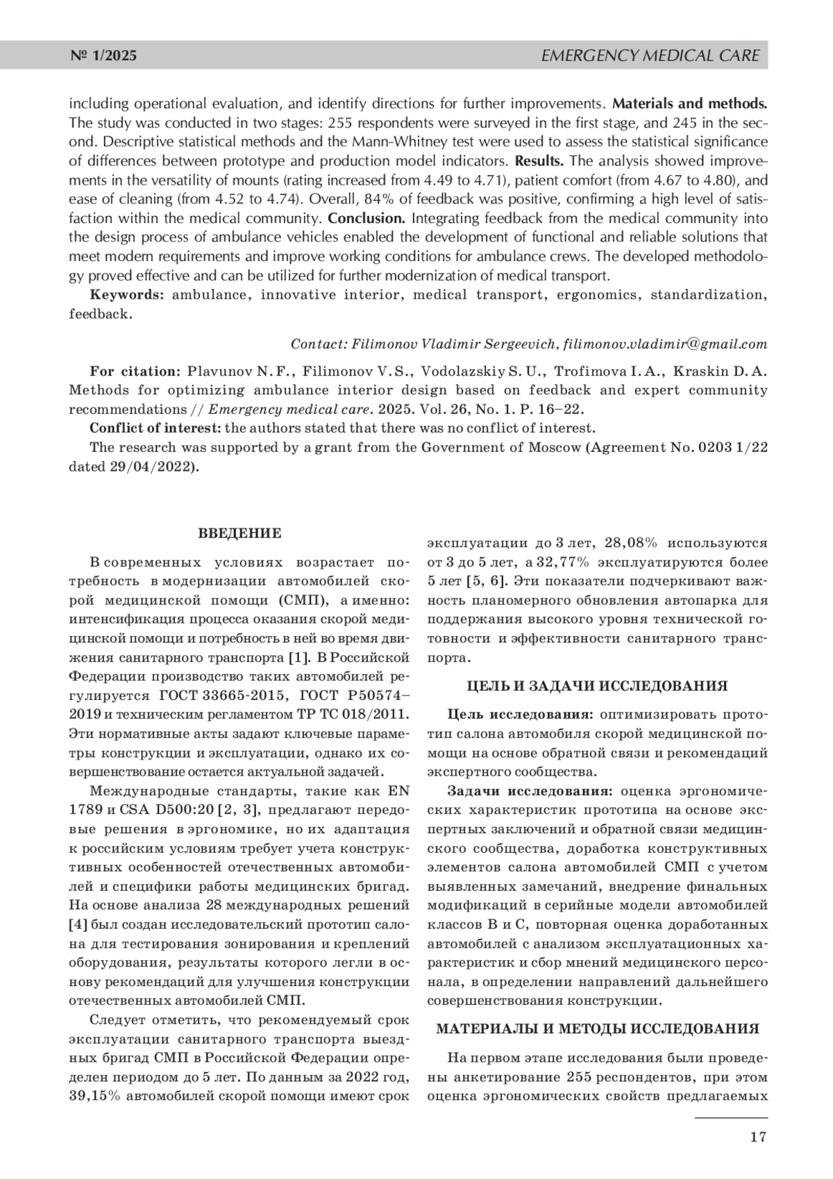 4. 	Плавунов Н. Ф., Филимонов В. С., Клюкин М. И. Эргономическое проектирование и эффективность инновационного салона санитарного транспорта для службы скорой медицинской помощи: операционные показатели и влияние на качество экстренной помощи // Медицинский алфавит. 2024. Т. 35, № 4. С. 114-120.