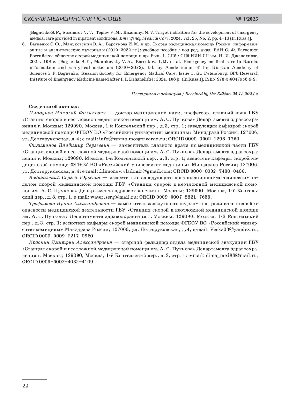 5. 	Багненко С. Ф., Стожаров В. В., Теплов В. М., Разумный Н. В. Целевые показатели развития скорой медицинской помощи, оказываемой в стационарных условиях // Скорая медицинская помощь. 2024. Т. 25, № 2. С. 4-10.
