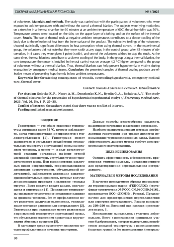 Профилактика гипотермии у раненых и пострадавших остается актуальной проблемой при оказании помощи раненым и пострадавшим с политравмой. Цель исследования: в эксперименте с участием добровольцев оценить эффективность и безопасность применения термопокрывала, предназначенного для предотвращения переохлаждения пострадавшего. Материалы и методы исследования. Исследование выполнялось с участием добровольцев, которые подвергались воздействию холодной температуры с использованием и без использования термоодеяла. Испытуемые находились неподвижно лежа на носилках в термокамере в течение 60 минут при температуре окружающей среды 0 °C, влажность воздуха составляла 50%. Датчики температуры располагались на коже, на верхнем слое одежды и на поверхности термопокрывала. Результаты. Использование термопокрывал при отрицательных температурах окружающей среды способствует более медленному охлаждению организма вследствие отражения тепла от внутренней поверхности изделия. Субъективные ощущения добровольцев показали статистически значимые отличия в теплоощущении при использовании термопокрывал. В опытной группе добровольцы не отмечали, что на каком‑либо этапе им было «холодно», в группе контроля спустя 45 минут наблюдения в 4 случаях ставили 1 балл («холодно»), а один из добровольцев пожелал прекратить исследование. При этом термопокрывала способствуют более медленному остыванию тела. В группе с использованием термопокрывала температура ядра (датчик установлен в ротовой полости) была в среднем выше на 4,2 °C в сравнении с группой добровольцев без термопокрывала. Таким образом, термпопокрывала могут способствовать профилактике гипотермии пострадавших в ходе эвакуации бригадами скорой медицинской помощи. Заключение: представленные образцы изделия термопокрывала являются эффективными средствами профилактики переохлаждения человека в условиях низких температур окружающей среды.