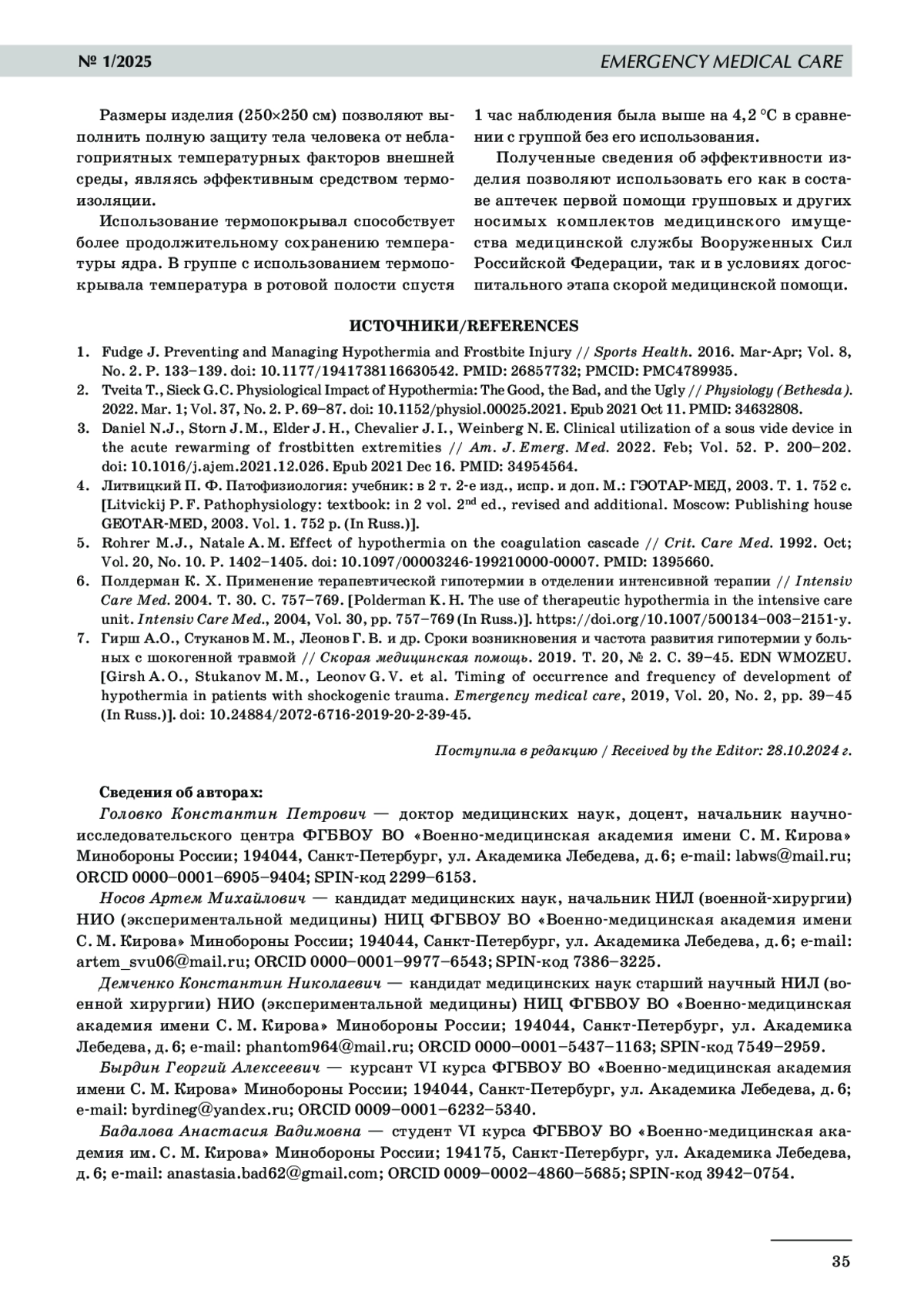 7. Гирш А.О., Стуканов М. М., Леонов Г. В. и др. Сроки возникновения и частота развития гипотермии у больных с шокогенной травмой // Скорая медицинская помощь. 2019. Т. 20, № 2. С. 39-45.