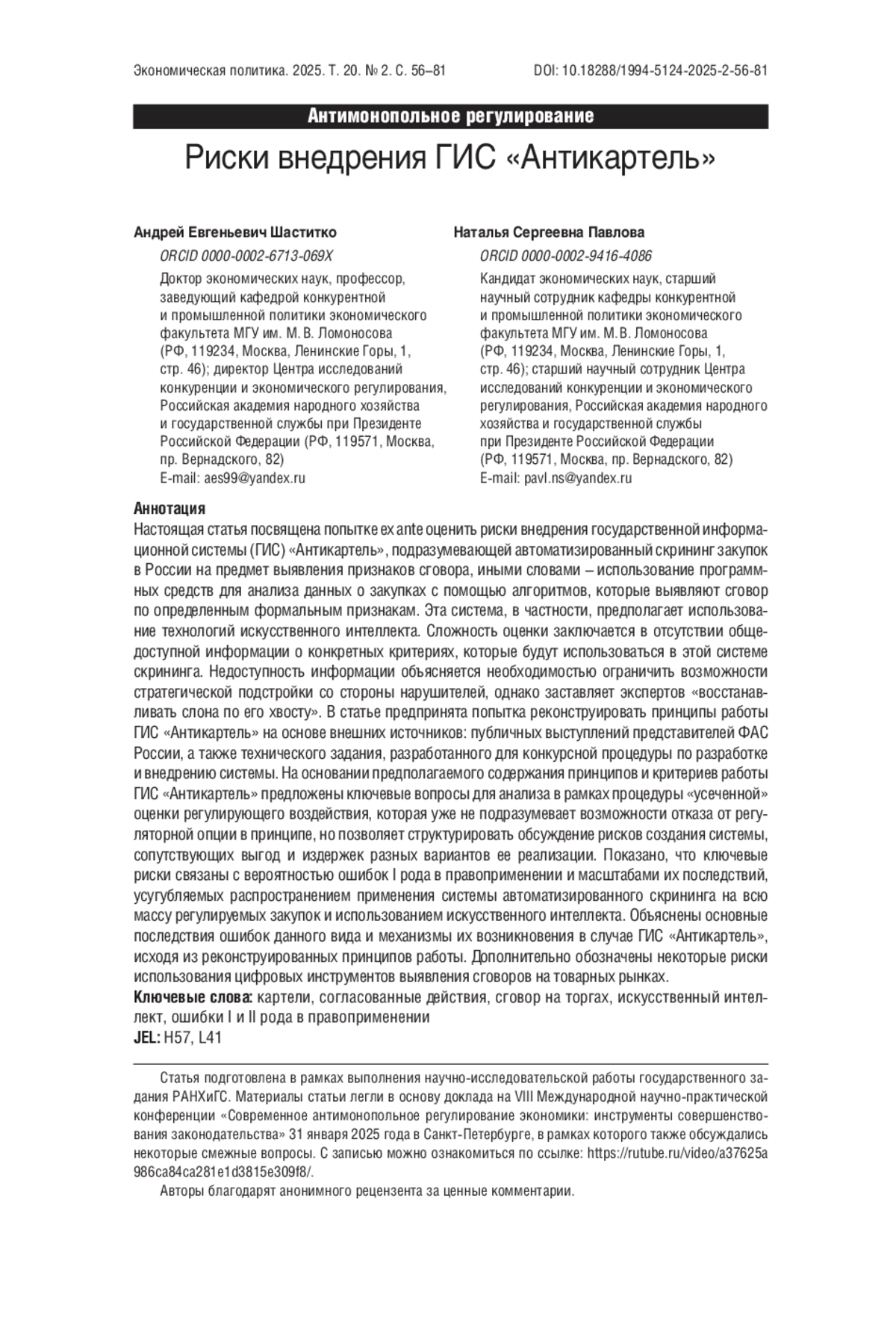 20. Katsoulacos Y., Avdasheva S., Golovanova S. Determinants of the (Slow) Development of Effect-Based Competition Enforcement: Testing the Impact of Judicial Review on the Choice of Legal Standards by Competition Authorities // Journal of Industry, Competition and Trade. 2021. Vol. 21. No 1. P. 103-122.