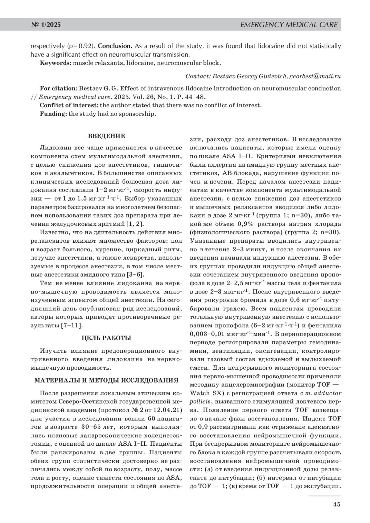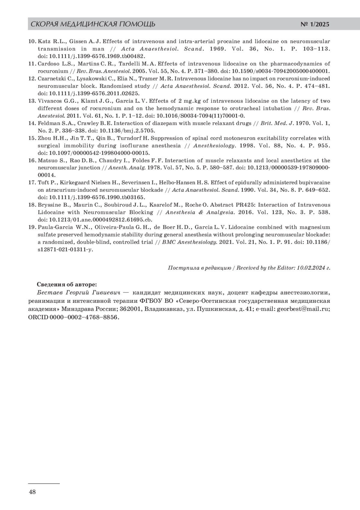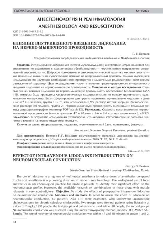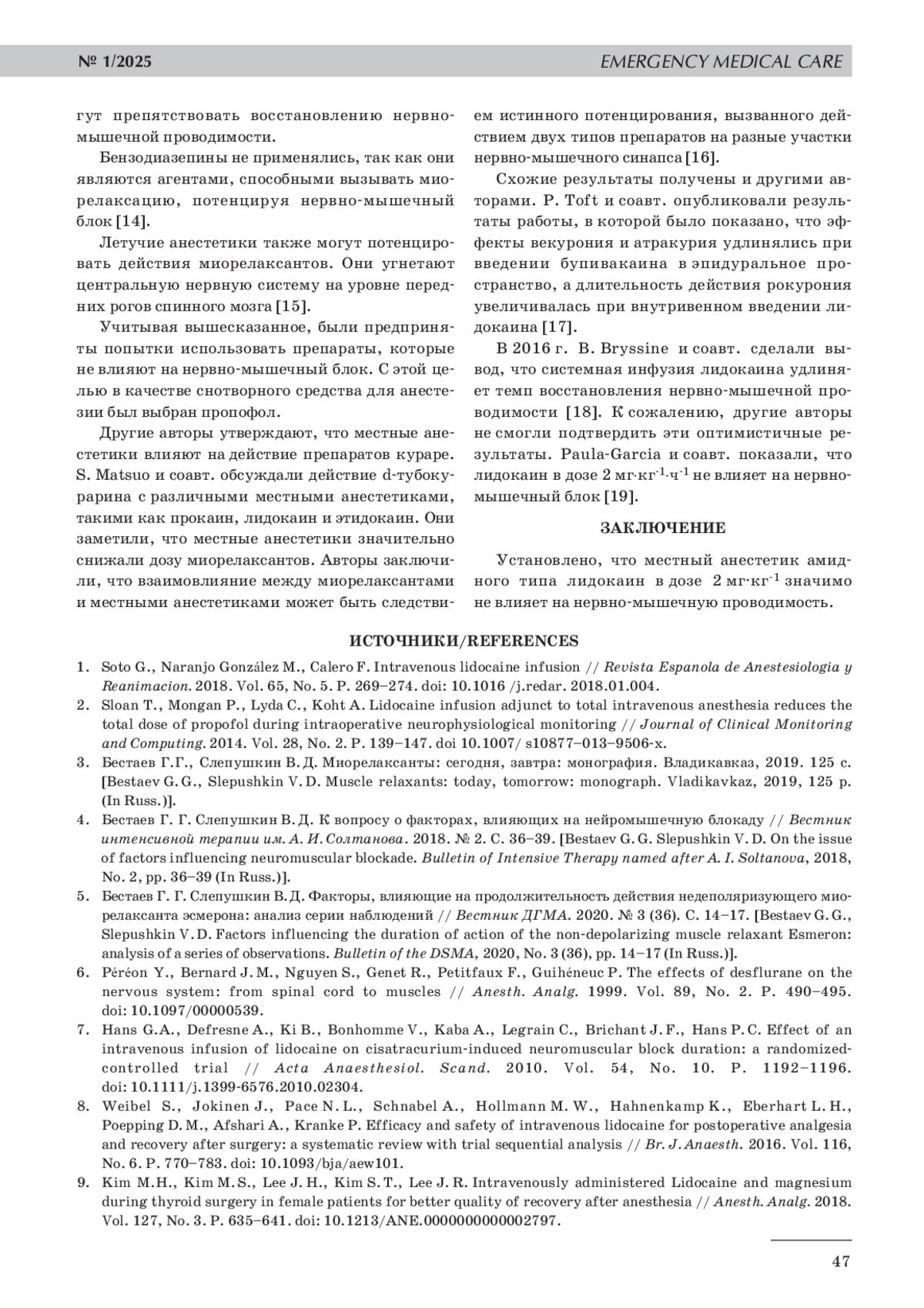 7. Hans G.A., Defresne A., Ki B., Bonhomme V., Kaba A., Legrain C., Brichant J. F., Hans P. C. Effect of an intravenous infusion of lidocaine on cisatracurium-induced neuromuscular block duration: a randomized-controlled trial // Acta Anaesthesiol. Scand. 2010. Vol. 54, No. 10. P. 1192-1196. DOI: 10.1111/j.1399-6576.2010.02304