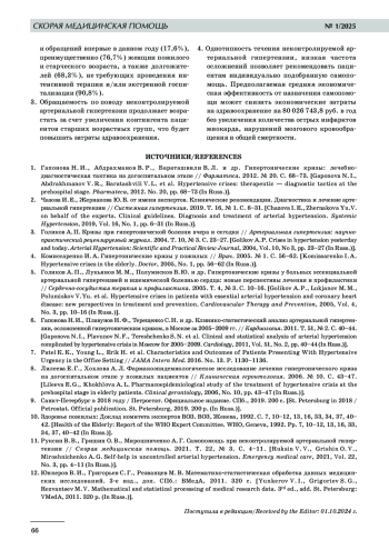 7. 	Patel К. К., Young L., Erik H. et al. Characteristics and Outcomes of Patients Presenting With Hypertensive Urgency in the Office Setting // JAMA Intern Med. 2016. No. 13. P. 1130-1136.