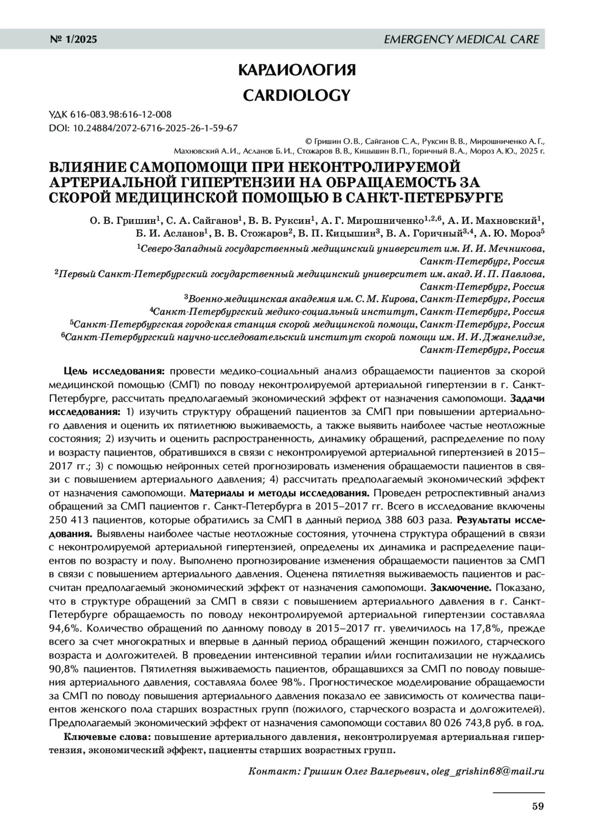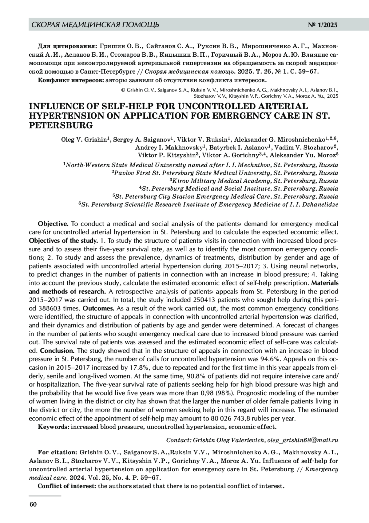 11. 	Руксин В. В., Гришин О. В., Мирошниченко А. Г. Самопомощь при неконтролируемой артериальной гипертензии // Скорая медицинская помощь. 2021. Т. 22, № 3. С. 4-11.