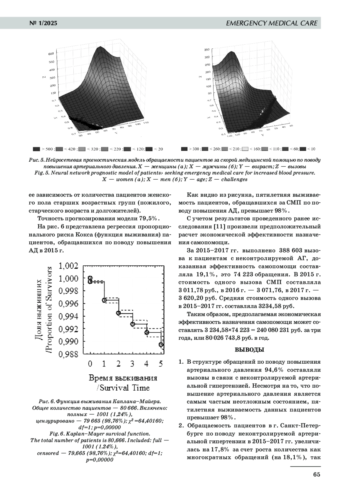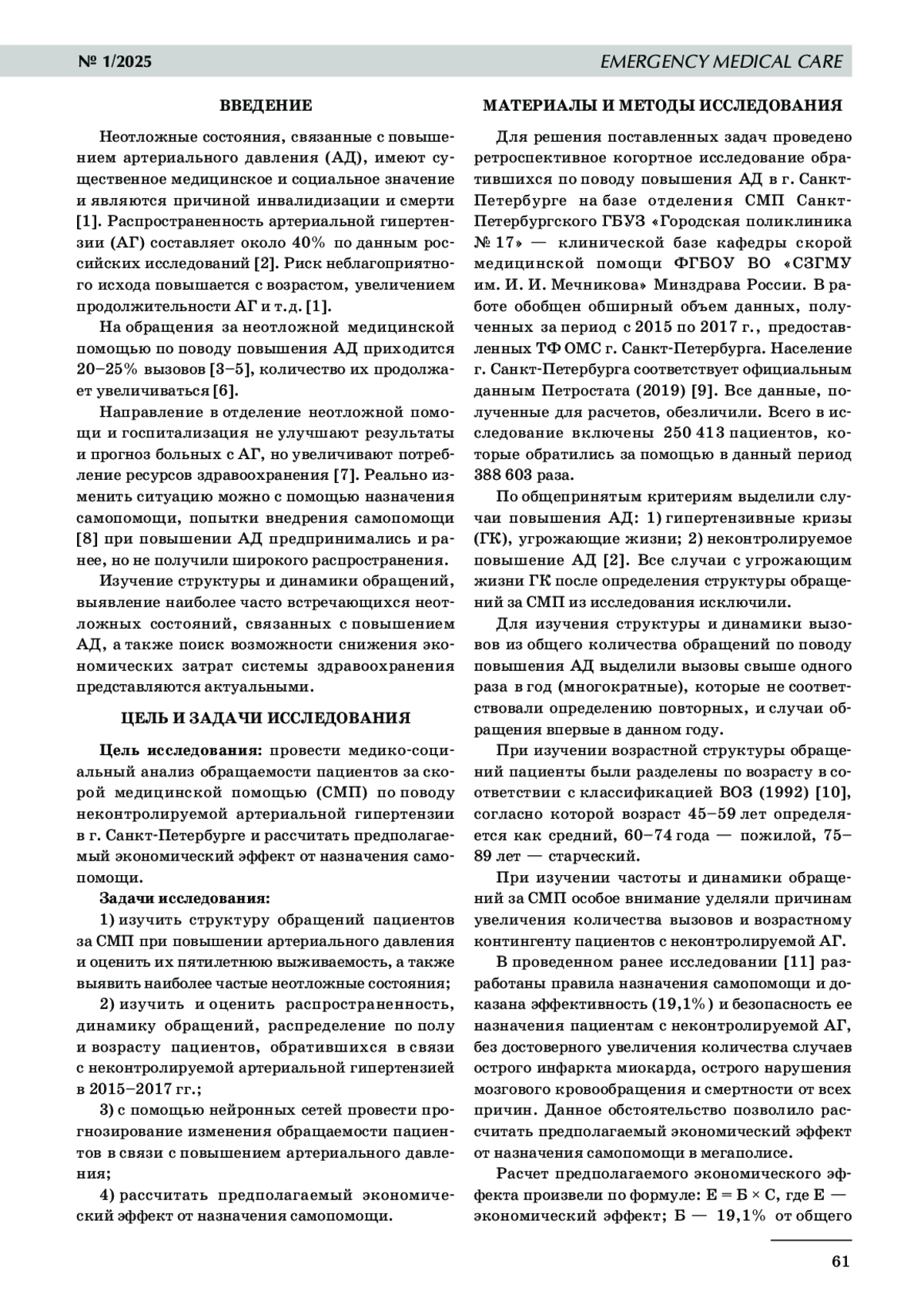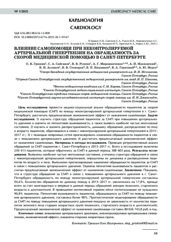Цель исследования: провести медико-социальный анализ обращаемости пациентов за скорой медицинской помощью (СМП) по поводу неконтролируемой артериальной гипертензии в г. Санкт-Петербурге, рассчитать предполагаемый экономический эффект от назначения самопомощи. Задачи исследования: 1) изучить структуру обращений пациентов за СМП при повышении артериального давления и оценить их пятилетнюю выживаемость, а также выявить наиболее частые неотложные состояния; 2) изучить и оценить распространенность, динамику обращений, распределение по полу и возрасту пациентов, обратившихся в связи с неконтролируемой артериальной гипертензией в 2015– 2017 гг.; 3) с помощью нейронных сетей прогнозировать изменения обращаемости пациентов в связи с повышением артериального давления; 4) рассчитать предполагаемый экономический эффект от назначения самопомощи. Материалы и методы исследования. Проведен ретроспективный анализ обращений за СМП пациентов г. Санкт-Петербурга в 2015–2017 гг. Всего в исследование включены 250 413 пациентов, которые обратились за СМП в данный период 388 603 раза. Результаты исследования. Выявлены наиболее частые неотложные состояния, уточнена структура обращений в связи с неконтролируемой артериальной гипертензией, определены их динамика и распределение пациентов по возрасту и полу. Выполнено прогнозирование изменения обращаемости пациентов за СМП в связи с повышением артериального давления. Оценена пятилетняя выживаемость пациентов и рассчитан предполагаемый экономический эффект от назначения самопомощи. Заключение. Показано, что в структуре обращений за СМП в связи с повышением артериального давления в г. Санкт-Петербурге обращаемость по поводу неконтролируемой артериальной гипертензии составляла 94,6%. Количество обращений по данному поводу в 2015–2017 гг. увеличилось на 17,8%, прежде всего за счет многократных и впервые в данный период обращений женщин пожилого, старческого возраста и долгожителей. В проведении интенсивной терапии и/или госпитализации не нуждались 90,8% пациентов. Пятилетняя выживаемость пациентов, обращавшихся за СМП по поводу повышения артериального давления, составляла более 98%. Прогностическое моделирование обращаемости за СМП по поводу повышения артериального давления показало ее зависимость от количества пациентов женского пола старших возрастных групп (пожилого, старческого возраста и долгожителей). Предполагаемый экономический эффект от назначения самопомощи составил 80 026 743,8 руб. в год.