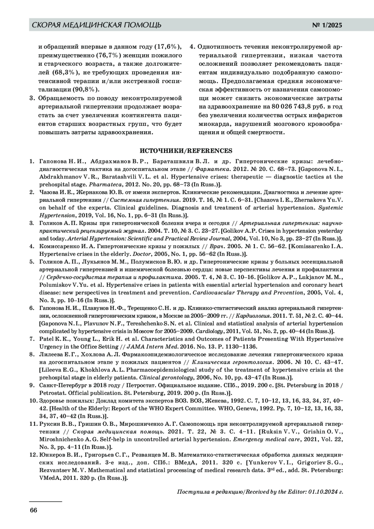 8. 	Лилеева Е. Г., Хохлова А. Л. Фармакоэпидемиологическое исследование лечения гипертонического криза на догоспитальном этапе у пожилых пациентов // Клиническая геронтология. 2006. № 10. С. 43-47.