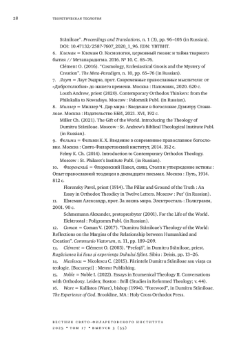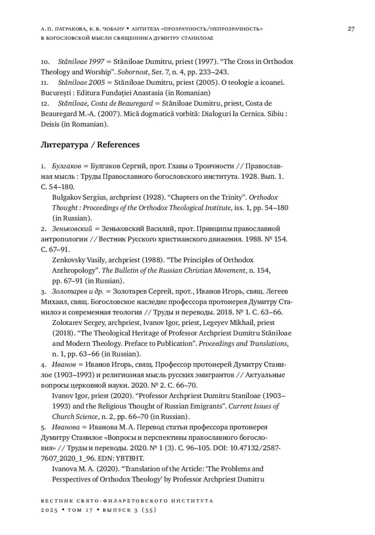 5. 	Иванова М. А. Перевод статьи профессора протоиерея Думитру Станилое “Вопросы и перспективы православного богословия” // Труды и переводы. 2020. № 1 (3). С. 96-105. 10.47132/2587- 7607_2020_1_96. DOI: 10.47132/2587-7607_2020_1_96 EDN: YBTBHT