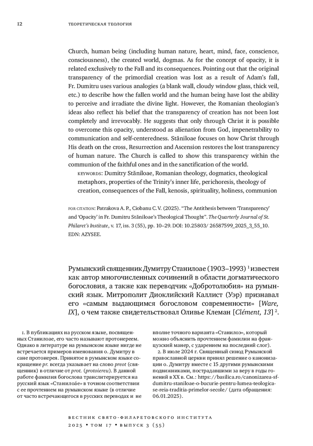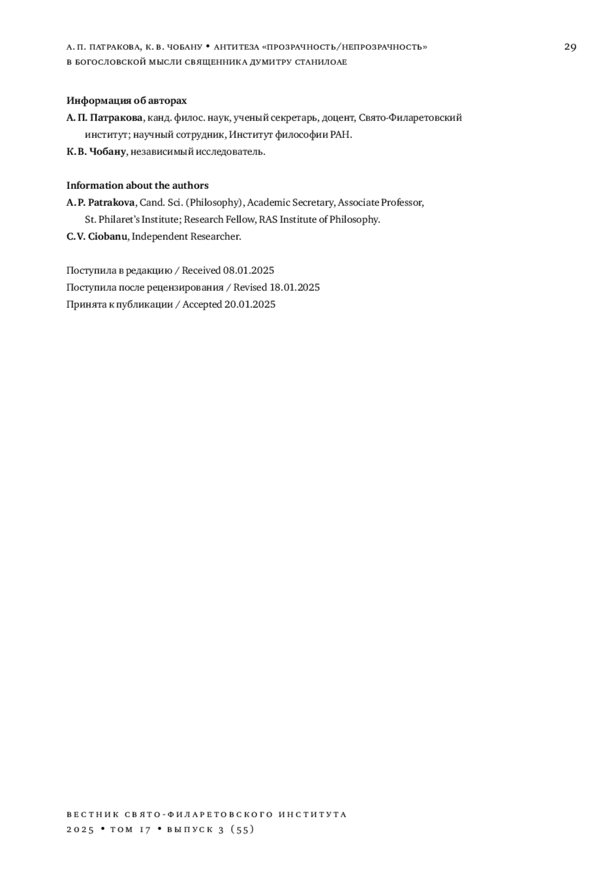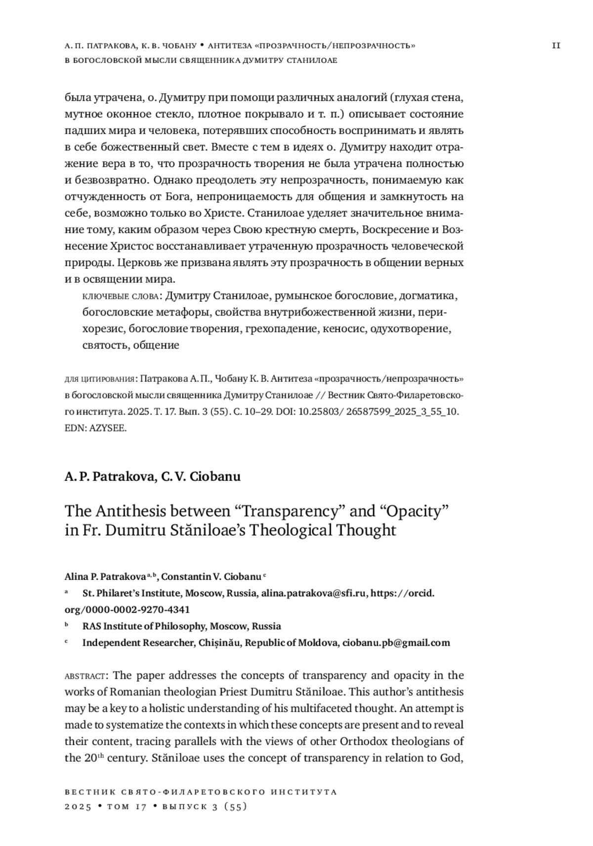 Статья посвящена осмыслению понятий «прозрачность» и «непрозрачность», используемых в качестве авторской антитезы в трудах румынского богослова свящ. Думитру Станилоае. Эта антитеза может быть одним из ключей к целостному пониманию его многогранной мысли. В статье предпринята попытка систематизировать контексты, в которых присутствуют эти понятия, и раскрыть их содержание, прослеживая параллели с взглядами других православных богословов ХХ в. Станилоае употребляет понятие «прозрачность» в отношении Бога, Церкви, человека (в том числе его природы, сердца, разума, лица, совести, сознания), тварного мира, догматов. Понятие «непрозрачность» употребляется исключительно в связи с грехопадением и его последствиями. Указывая на то, что в результате грехопадения Адама изначальная прозрачность первозданного творения была утрачена, о. Думитру при помощи различных аналогий (глухая стена, мутное оконное стекло, плотное покрывало и т. п.) описывает состояние падших мира и человека, потерявших способность воспринимать и являть в себе божественный свет. Вместе с тем в идеях о. Думитру находит отражение вера в то, что прозрачность творения не была утрачена полностью и безвозвратно. Однако преодолеть эту непрозрачность, понимаемую как отчужденность от Бога, непроницаемость для общения и замкнутость на себе, возможно только во Христе. Станилоае уделяет значительное внимание тому, каким образом через Свою крестную смерть, Воскресение и Вознесение Христос восстанавливает утраченную прозрачность человеческой природы. Церковь же призвана являть эту прозрачность в общении верных и в освящении мира.