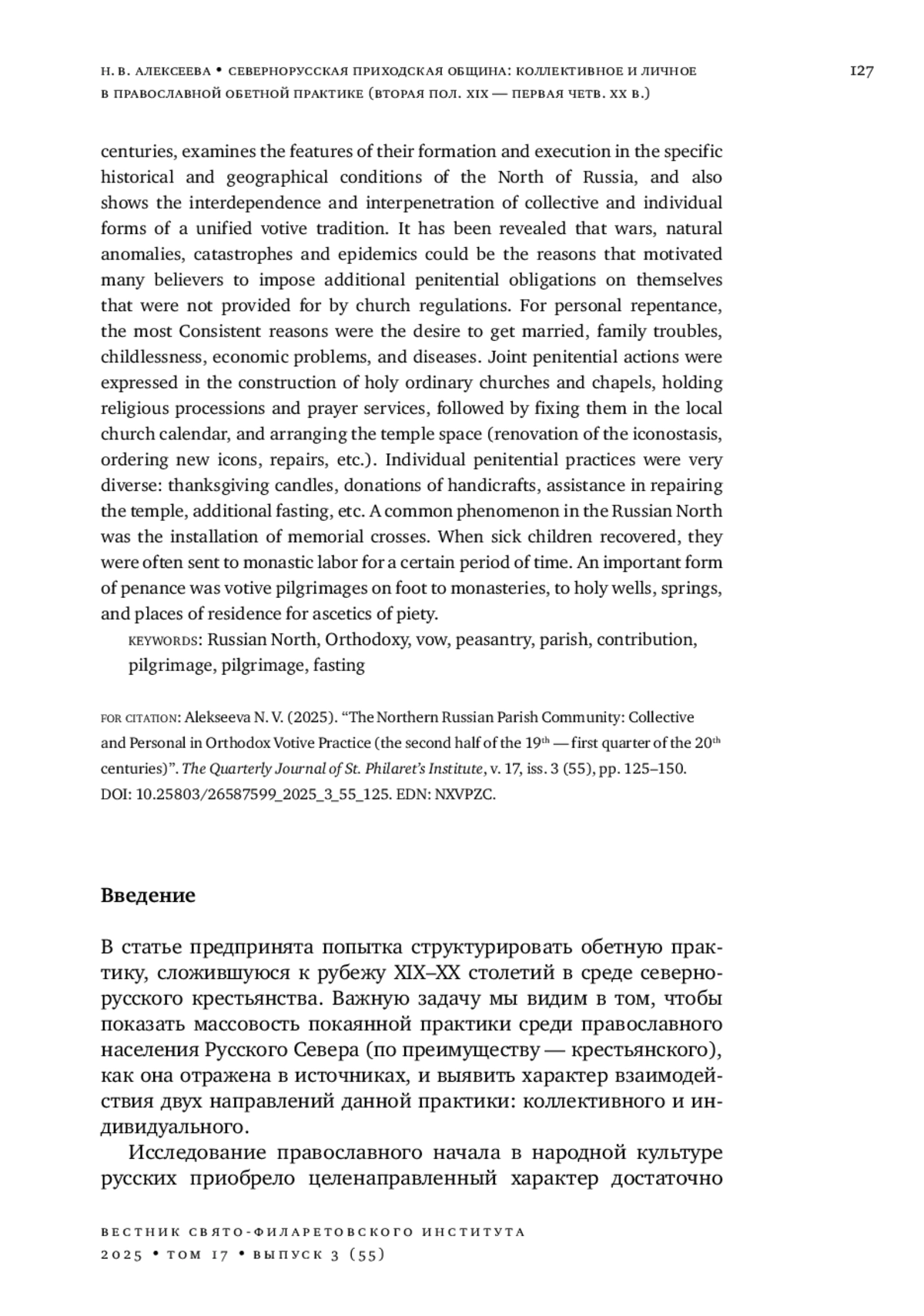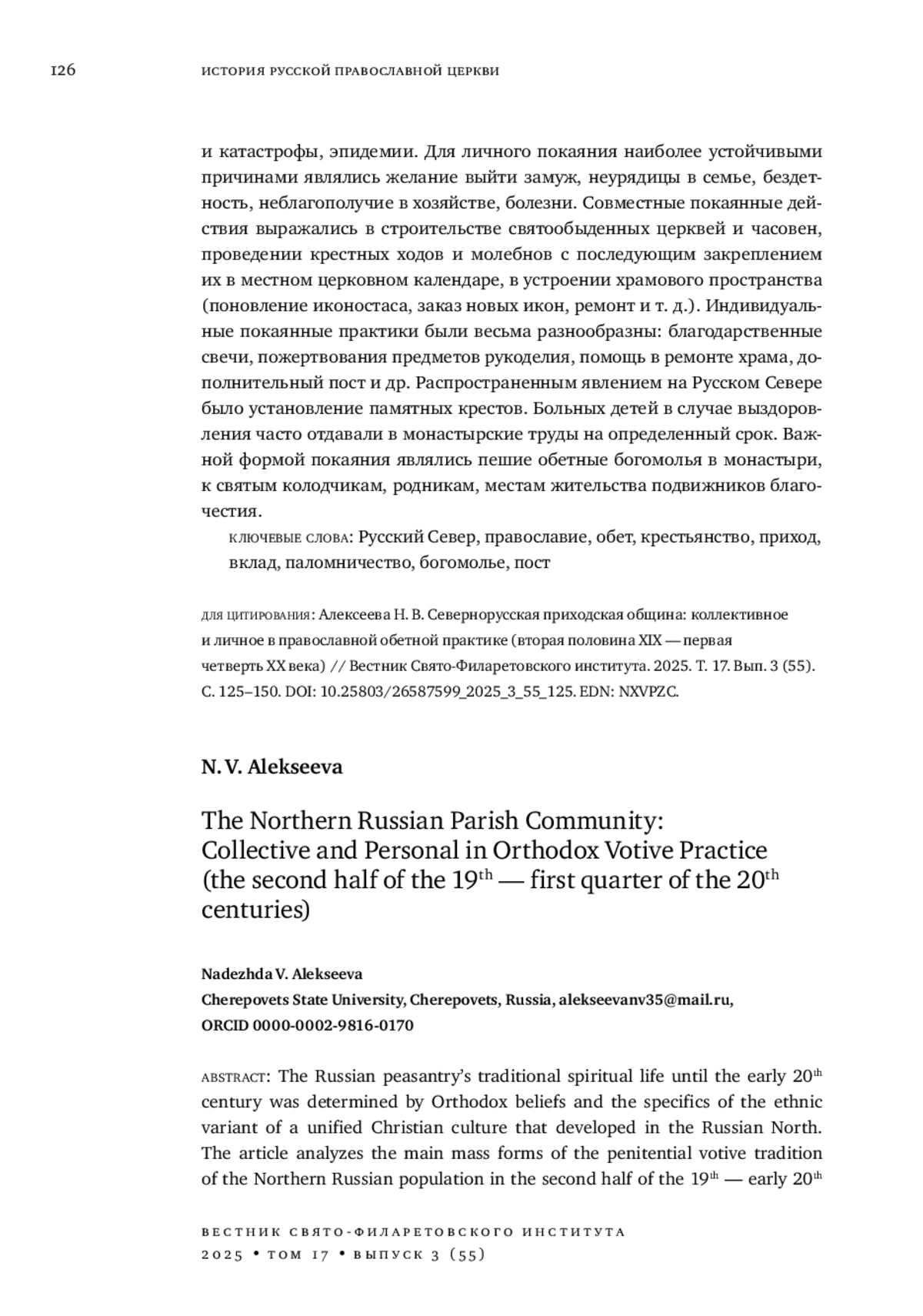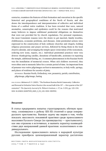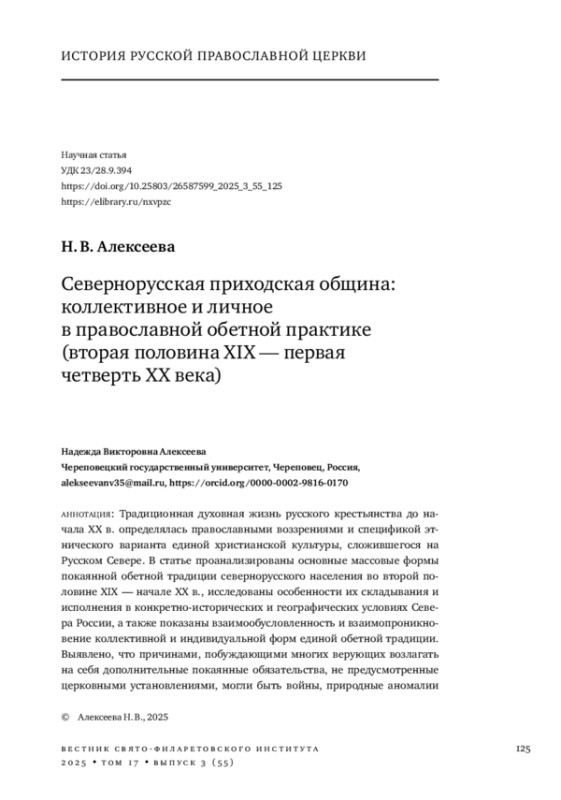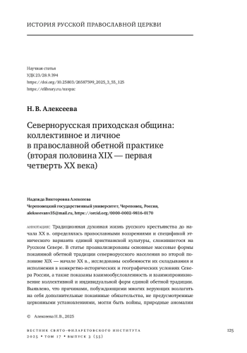 Традиционная духовная жизнь русского крестьянства до начала XX в. определялась православными воззрениями и спецификой этнического варианта единой христианской культуры, сложившегося на Русском Севере. В статье проанализированы основные массовые формы покаянной обетной традиции севернорусского населения во второй половине XIX - начале XX в., исследованы особенности их складывания и исполнения в конкретно-исторических и географических условиях Севера России, а также показаны взаимообусловленность и взаимопроникновение коллективной и индивидуальной форм единой обетной традиции. Выявлено, что причинами, побуждающими многих верующих возлагать на себя дополнительные покаянные обязательства, не предусмотренные церковными установлениями, могли быть войны, природные аномалии и катастрофы, эпидемии. Для личного покаяния наиболее устойчивыми причинами являлись желание выйти замуж, неурядицы в семье, бездетность, неблагополучие в хозяйстве, болезни. Совместные покаянные действия выражались в строительстве святообыденных церквей и часовен, проведении крестных ходов и молебнов с последующим закреплением их в местном церковном календаре, в устроении храмового пространства (поновление иконостаса, заказ новых икон, ремонт и т. д.). Индивидуальные покаянные практики были весьма разнообразны: благодарственные свечи, пожертвования предметов рукоделия, помощь в ремонте храма, дополнительный пост и др. Распространенным явлением на Русском Севере было установление памятных крестов. Больных детей в случае выздоровления часто отдавали в монастырские труды на определенный срок. Важной формой покаяния являлись пешие обетные богомолья в монастыри, к святым колодчикам, родникам, местам жительства подвижников благочестия.