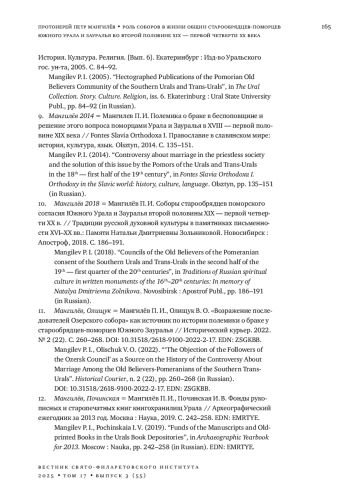 21. 	Мангилёв П. И., Починская И. В. Фонды рукописных и старопечатных книг книгохранилищ Урала // Археографический ежегодник за 2013 год. Москва: Наука, 2019. С. 242-258. EDN: EMRTYE