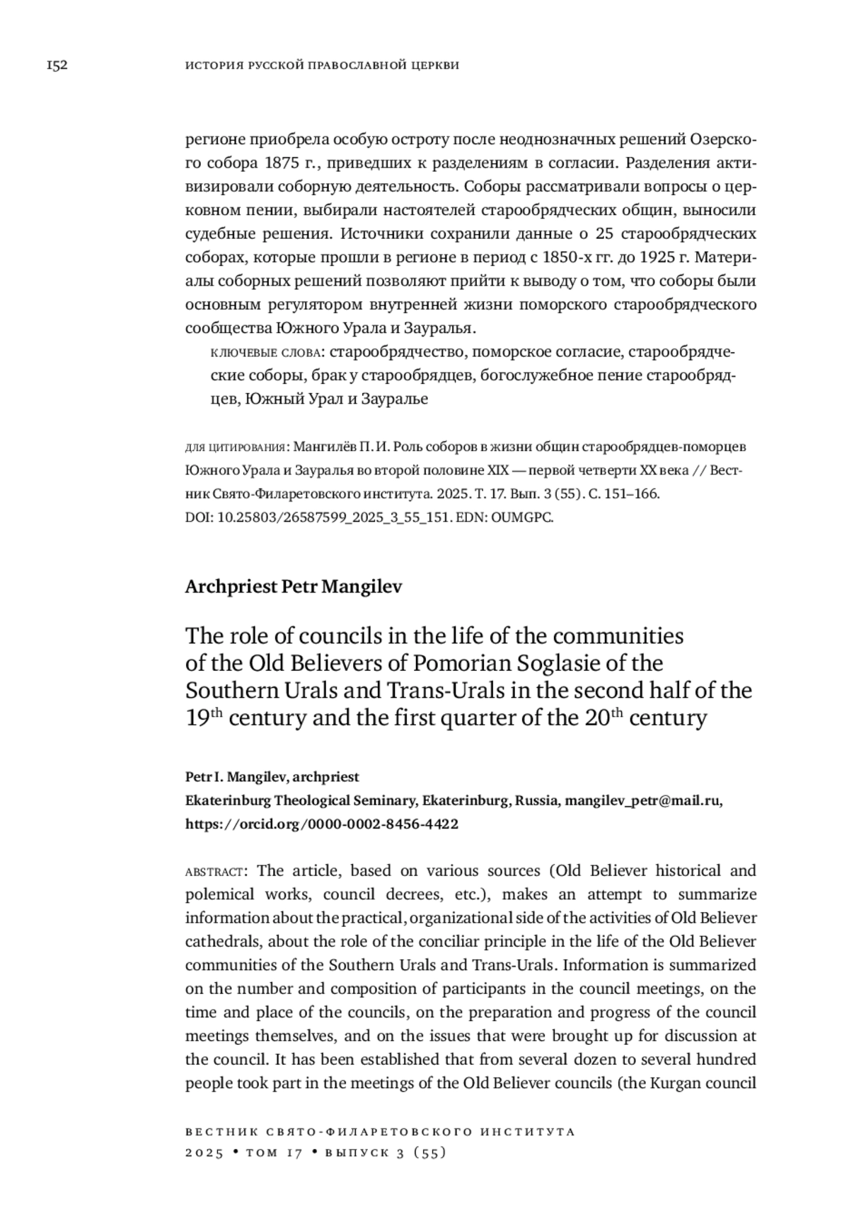 18. 	Мангилев П. И. Полемика о браке в беспоповщине и решение этого вопроса поморцами Урала и Зауралья в XVIII - первой половине XIX века // Fontes Slavia Orthodoxa I. Православие в славянском мире: история, культура, язык. Olsztyn, 2014. С. 135-151.
