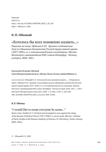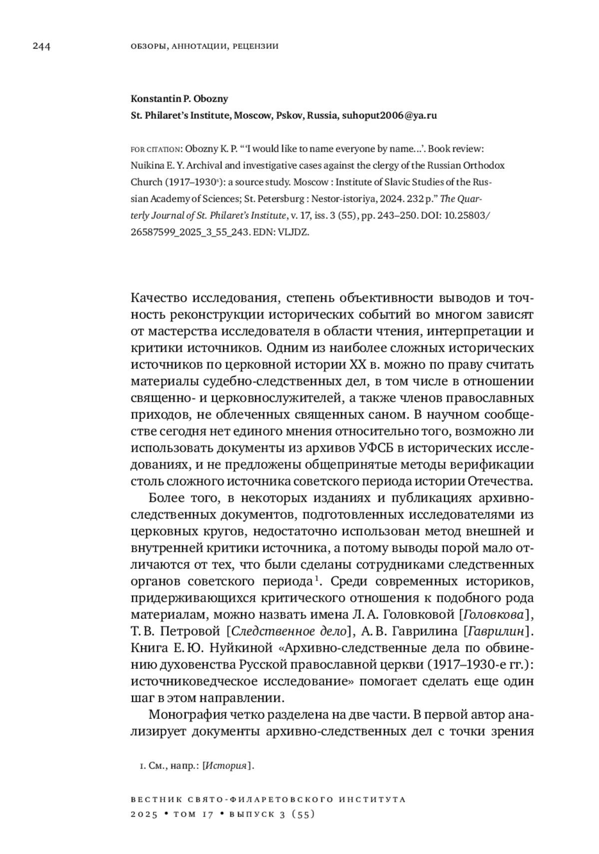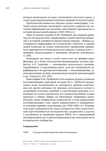 Более того, в некоторых изданиях и публикациях архивноследственных документов, подготовленных исследователями из церковных кругов, недостаточно использован метод внешней и внутренней критики источника, а потому выводы порой мало отличаются от тех, что были сделаны сотрудниками следственных органов советского периода 1. Среди современных историков, придерживающихся критического отношения к подобного рода материалам, можно назвать имена Л. А. Головковой [Головкова], Т. В. Петровой [Следственное дело], А. В. Гаврилина [Гаврилин]. Книга Е. Ю. Нуйкиной «Архивно-с ледственные дела по обвинению духовенства Русской православной церкви (1917–1930-е гг.): источниковедческое исследование» помогает сделать еще один шаг в этом направлении.