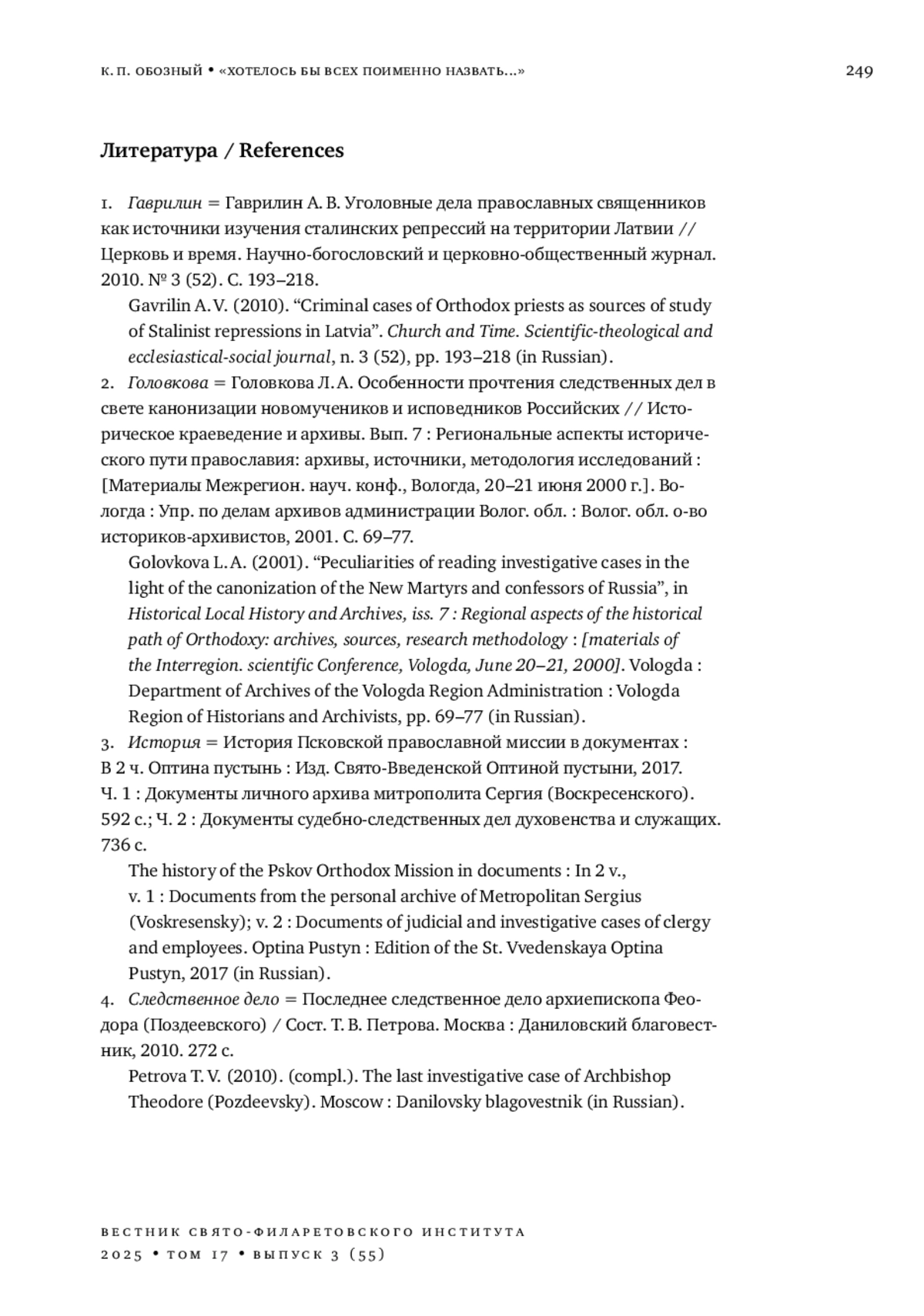 1. 	Гаврилин А. В. Уголовные дела православных священников как источники изучения сталинских репрессий на территории Латвии // Церковь и время. Научно-богословский и церковно-общественный журнал. 2010. № 3 (52). С. 193-218.