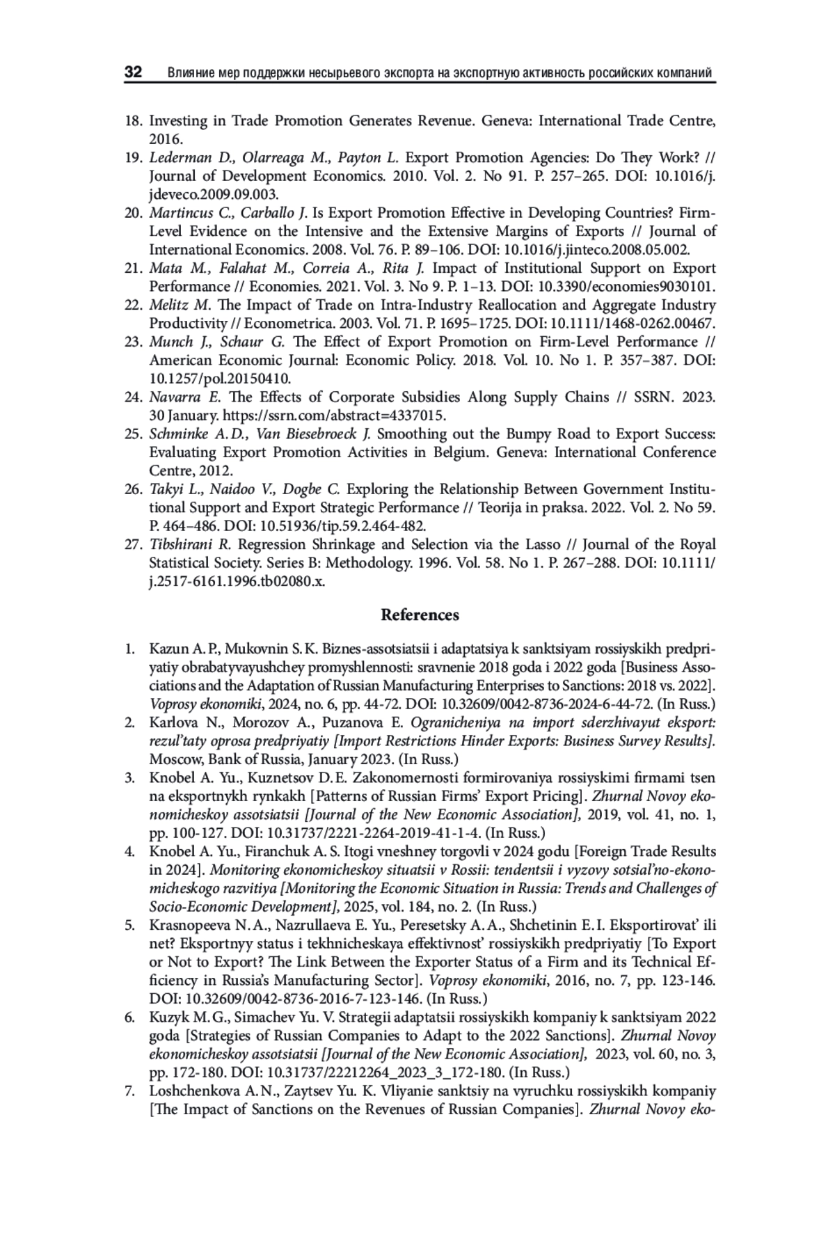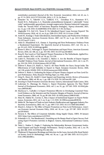 20. Martincus C., Carballo J. Is Export Promotion Effective in Developing Countries? FirmLevel Evidence on the Intensive and the Extensive Margins of Exports // Journal of International Economics. 2008. Vol. 76. P. 89-106. https://doi.org/10.1016/j.jinteco.2008.05.002.