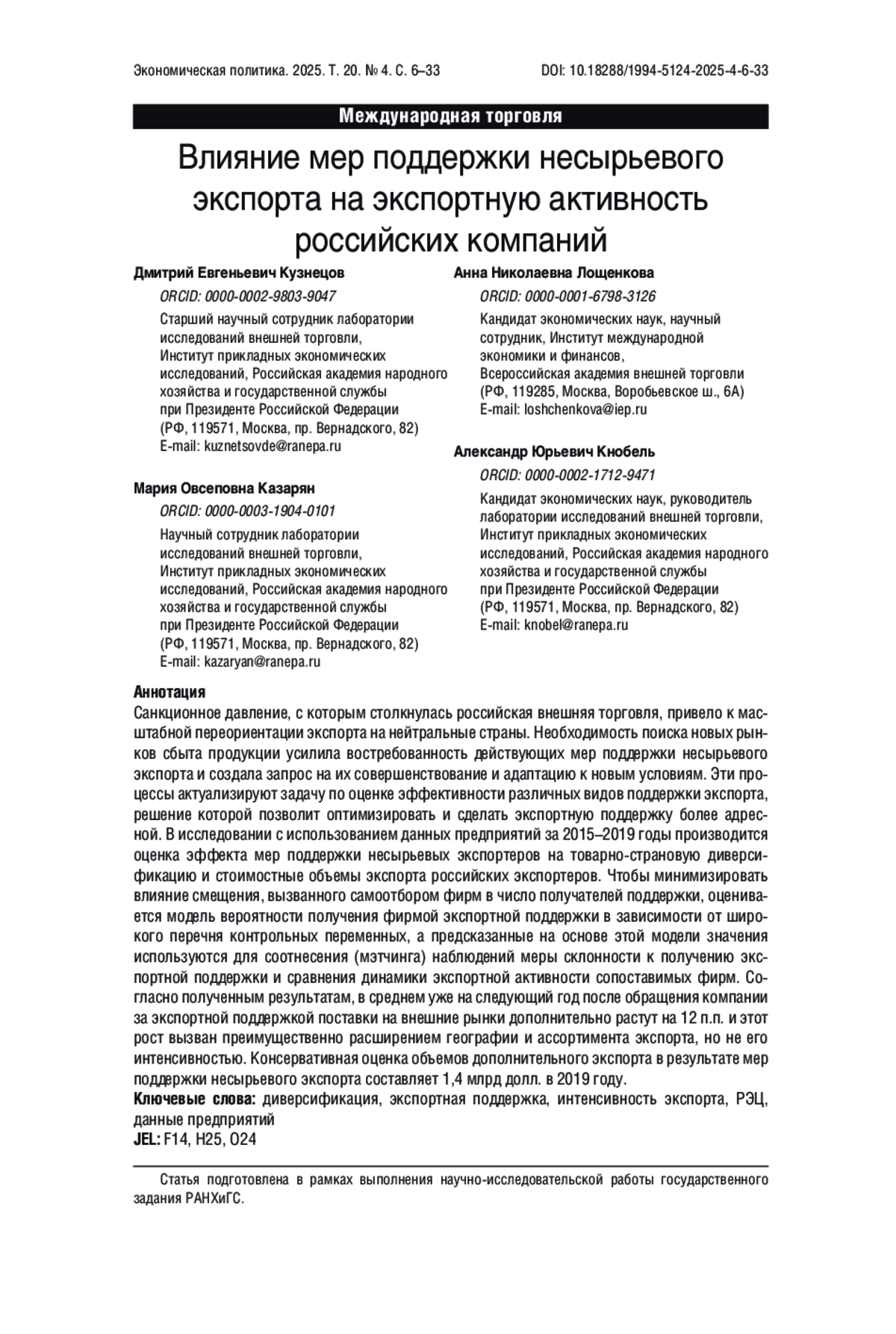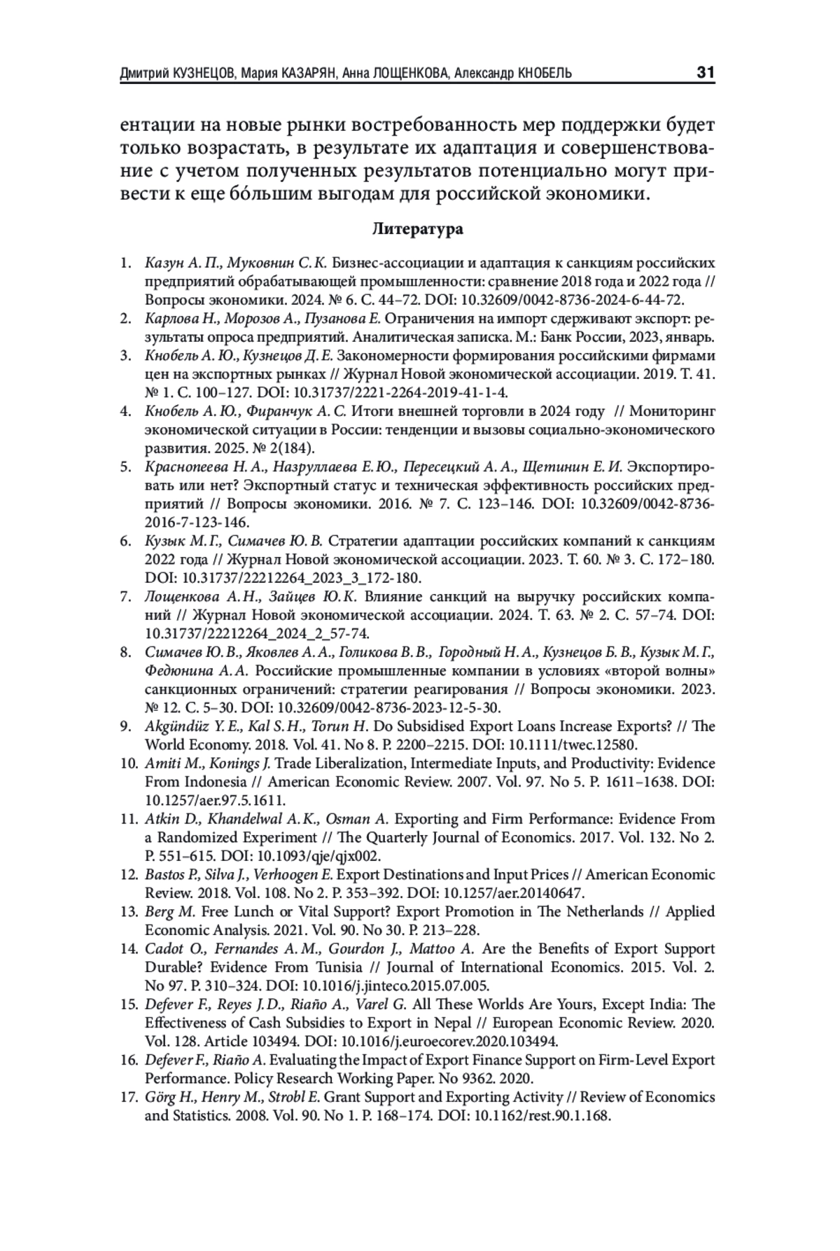 3. Кнобель А.Ю., Кузнецов Д.Е. Закономерности формирования российскими фирмами цен на экспортных рынках // Журнал Новой экономической ассоциации. 2019. Т. 41. № 1. С. 100-127. https://doi.org/10.31737/2221-2264-2019-41-1-4.