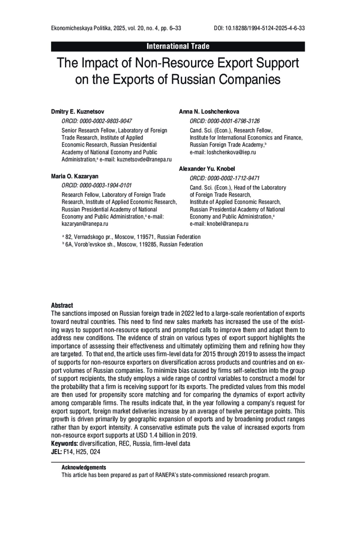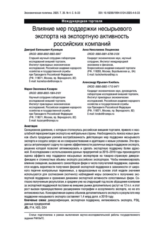 Санкционное давление, с которым столкнулась российская внешняя торговля, привело к масштабной переориентации экспорта на нейтральные страны. Необходимость поиска новых рынков сбыта продукции усилила востребованность действующих мер поддержки несырьевого экспорта и создала запрос на их совершенствование и адаптацию к новым условиям. Эти процессы актуализируют задачу по оценке эффективности различных видов поддержки экспорта, решение которой позволит оптимизировать и сделать экспортную поддержку более адресной. В исследовании с использованием данных предприятий за 2015–2019 годы производится оценка эффекта мер поддержки несырьевых экспортеров на товарно-страновую диверсификацию и стоимостные объемы экспорта российских экспортеров. Чтобы минимизировать влияние смещения, вызванного самоотбором фирм в число получателей поддержки, оценивается модель вероятности получения фирмой экспортной поддержки в зависимости от широкого перечня контрольных переменных, а предсказанные на основе этой модели значения используются для соотнесения (мэтчинга) наблюдений меры склонности к получению экспортной поддержки и сравнения динамики экспортной активности сопоставимых фирм. Согласно полученным результатам, в среднем уже на следующий год после обращения компании за экспортной поддержкой поставки на внешние рынки дополнительно растут на 12 п. п. и этот рост вызван преимущественно расширением географии и ассортимента экспорта, но не его интенсивностью. Консервативная оценка объемов дополнительного экспорта в результате мер поддержки несырьевого экспорта составляет 1,4 млрд долл. в 2019 году.