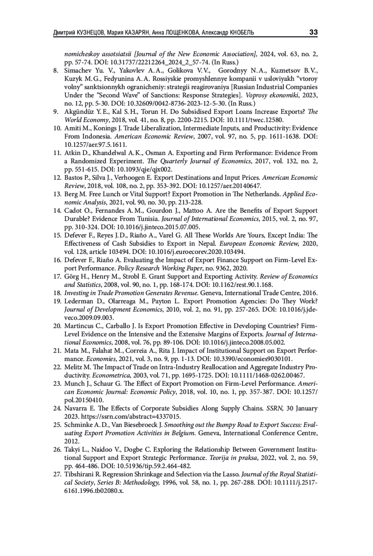 9. Akgündüz Y.E., Kal S.H., Torun H. Do Subsidised Export Loans Increase Exports? // The World Economy. 2018. Vol. 41. No 8. P. 2200-2215. https://doi.org/10.1111/twec.12580.