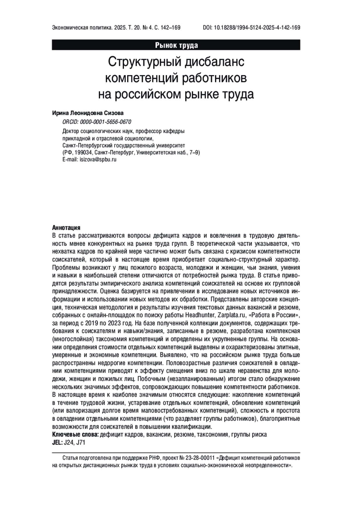В статье рассматриваются вопросы дефицита кадров и вовлечения в трудовую деятельность менее конкурентных на рынке труда групп. В теоретической части указывается, что нехватка кадров по крайней мере частично может быть связана с кризисом компетентности соискателей, который в настоящее время приобретает социально-структурный характер. Проблемы возникают у лиц пожилого возраста, молодежи и женщин, чьи знания, умения и навыки в наибольшей степени отличаются от потребностей рынка труда. В статье приводятся результаты эмпирического анализа компетенций соискателей на основе их групповой принадлежности. Оценка базируется на привлечении в исследование новых источников информации и использовании новых методов их обработки. Представлены авторские концепция, техническая методология и результаты изучения текстовых данных вакансий и резюме, собранных с онлайн-площадок по поиску работы Headhunter, Zarplata. ru, «Работа в России», за период с 2019 по 2023 год. На базе полученной коллекции документов, содержащих требования к соискателям и навыки/знания, записанные в резюме, разработана комплексная (многослойная) таксономия компетенций и определены их укрупненные группы. На основании определения стоимости отдельных компетенций выделены и охарактеризованы элитные, умеренные и экономные компетенции. Выявлено, что на российском рынке труда больше распространены недорогие компетенции. Половозрастные различия соискателей в овладении компетенциями приводят к эффекту смещения вниз по шкале неравенства для молодежи, женщин и пожилых лиц. Побочным (незапланированным) итогом стало обнаружение нескольких значимых эффектов, сопровождающих повышение компетентности работников. В настоящее время к наиболее значимым относятся следующие: накопление компетенций в течение трудовой жизни, устаревание отдельных компетенций, обновление компетенций (или валоризация долгое время маловостребованных компетенций), сложность и простота в овладении отдельными компетенциями (что разделяет группы работников), благоприятные возможности для соискателей в повышении квалификации.