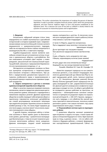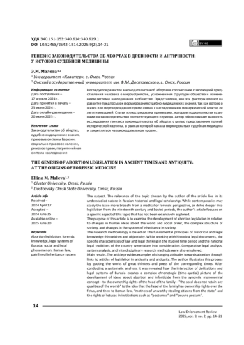 Исследуются развитие законодательства об абортах в соотношении с эволюцией представленного человека о мироустройстве, усложнении структуры общества и изменении системы наследования в обществе. Представлено, как эти факторы влияют на развитие предпосылок формирования бобно-медицинских знаний, так как вопрос о живо- или мертворождении прямо связан с наследованием монархической власти, ее легитимизацией. Статья иллюстрирована примерами, которые подкрепляются ссылками на законодательство соответствующего периода. Автор обосновывает углубленное исследование генезиса законодательства об абортах с Датой представления полной исторической картины, в рамках которой начинается формироваться судебная медицина и закрепляться на законодательном уровне.