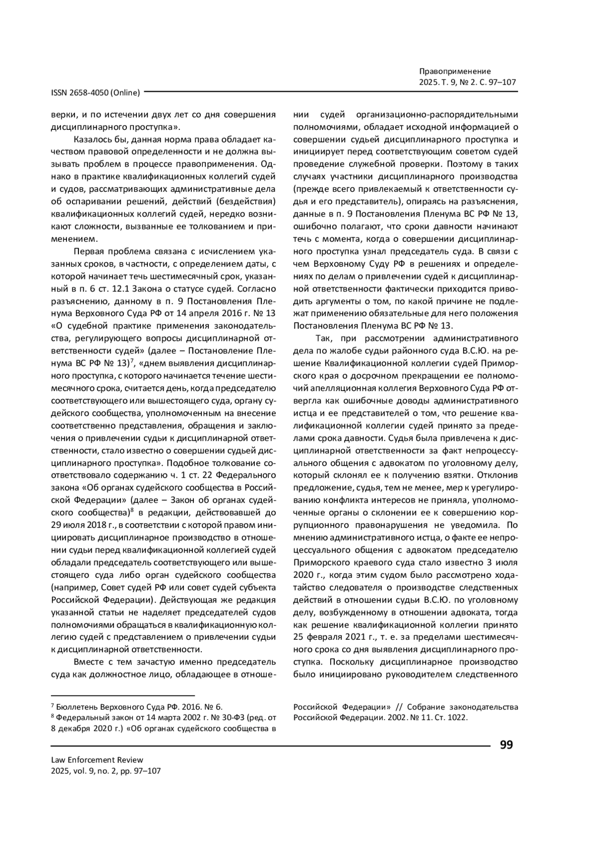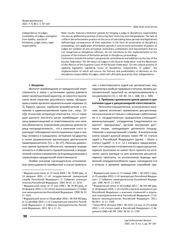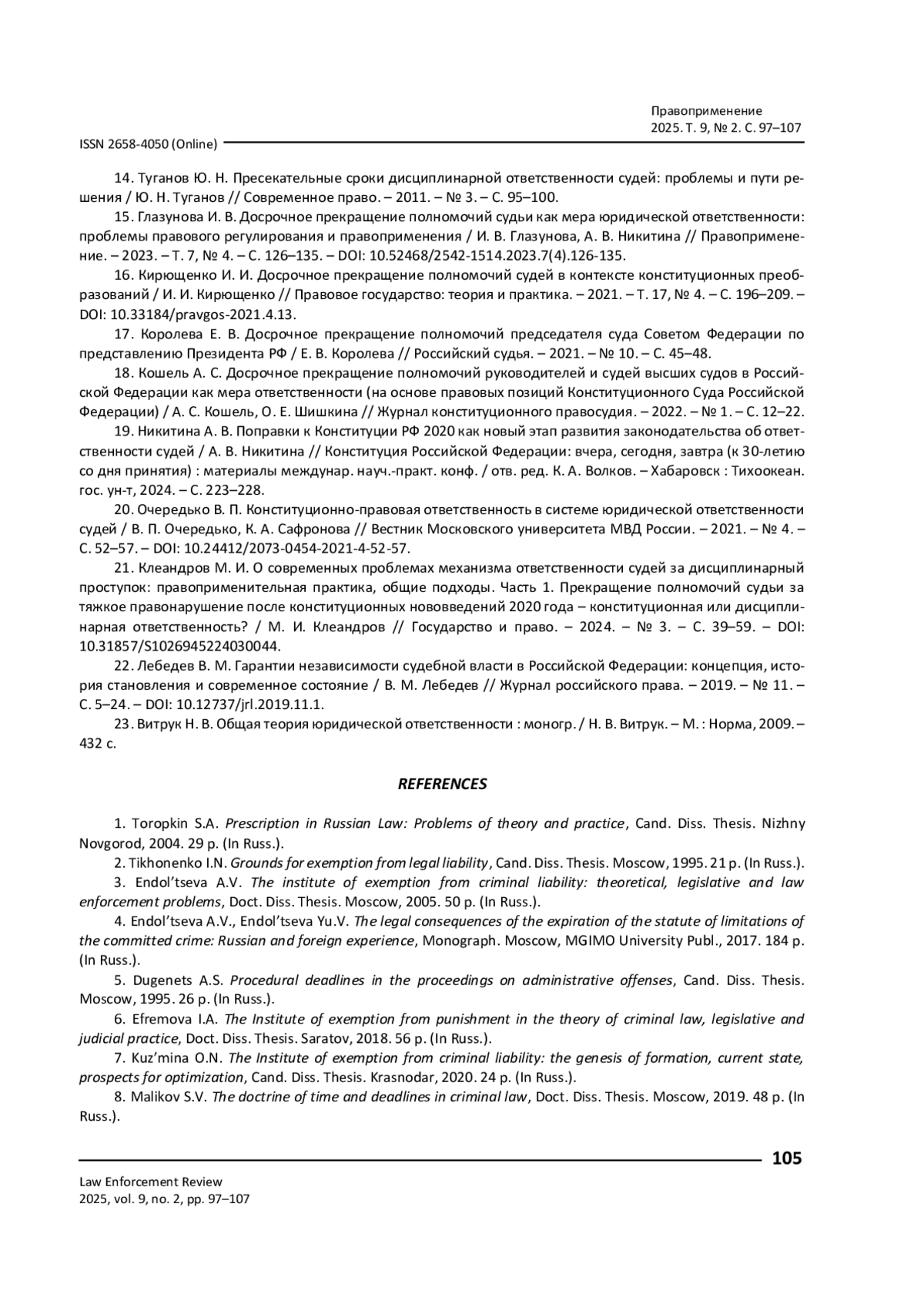 21. Клеандров М. И. О современных проблемах механизма ответственности судей за дисциплинарный проступок: правоприменительная практика, общие подходы. Часть 1. Прекращение полномочий судьи за тяжкое правонарушение после конституционных нововведений 2020 года - конституционная или дисциплинарная ответственность? / М. И. Клеандров // Государство и право. - 2024. - № 3. - С. 39-59. -. DOI: 10.31857/S1026945224030044
