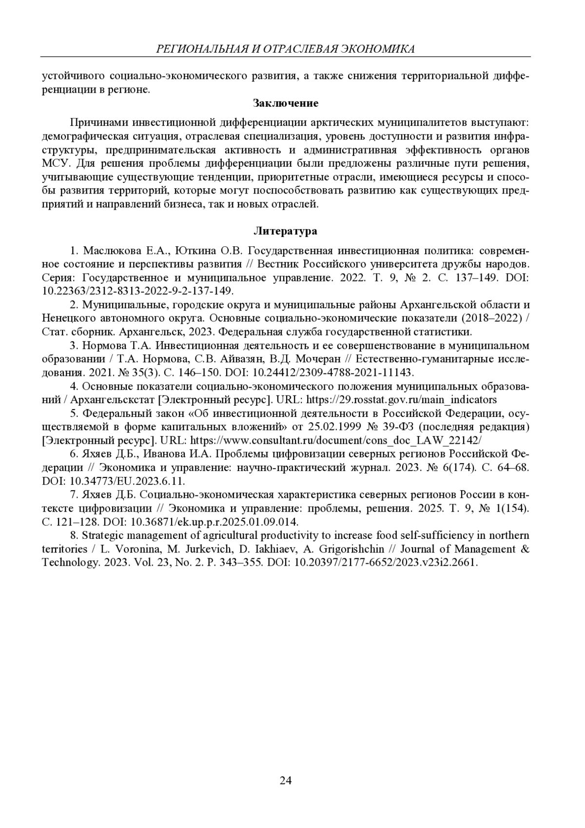 7. 	Яхяев Д.Б. Социально-экономическая характеристика северных регионов России в контексте цифровизации // Экономика и управление: проблемы, решения. 2025. Т. 9, № 1(154). С. 121-128.  DOI: 10.36871/ek.up.p.r.2025.01.09.014  EDN: GSRLRS