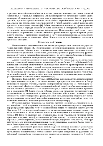 Сегодня на наших глазах происходит смена кадровых ориентиров в различных сферах, и прежде всего в тех отраслях экономики, которые ориентированы на поиски новых ресурсов, на инновации и формирование цифровой среды [10]. Современные предприятия функционируют в условиях высокой неопределённости и частых кризисов (экономических спадов, эпидемий, санкционных и социальных потрясений). Эти вызовы требуют от организации быстрой адаптации стратегий и процессов, прежде всего в сфере управления персоналом. Как отмечают исследователи, в условиях кризиса возникает необходимость переосмысления системы управления персоналом: она должна стать более экономичной и гибкой, ориентированной на новые антикризисные цели и задачи компании [4]. Гибкая кадровая политика помогает организациям выживать в сложные периоды, позволяя изменить численность и квалификационный состав сотрудников без кардинального снижения эффективности. Цель данной научной статьи – систематизировать теоретические подходы к гибкой кадровой политике, проанализировать расширенную практику её применения в российских и зарубежных компаниях и предложить практические рекомендации по реализации гибких HR-инструментов, способствующих адаптации к кризисным ситуациям
