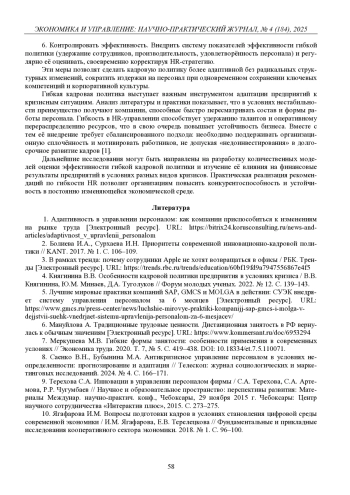 8. 	Саенко В.Н., Бубынина М.А. Антикризисное управление персоналом в условиях неопределенности: прогнозирование и адаптация // Телескоп: журнал социологических и маркетинговых исследований. 2024. № 4. С. 166-171.