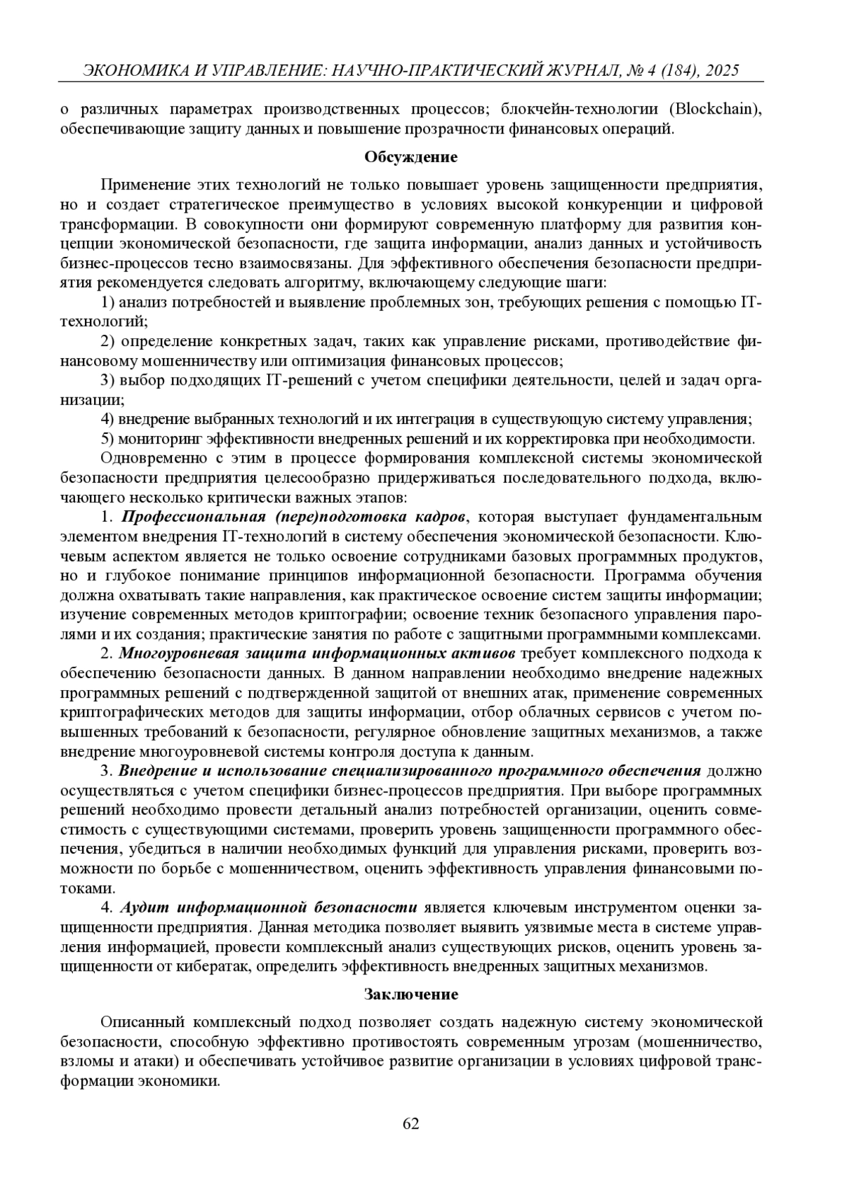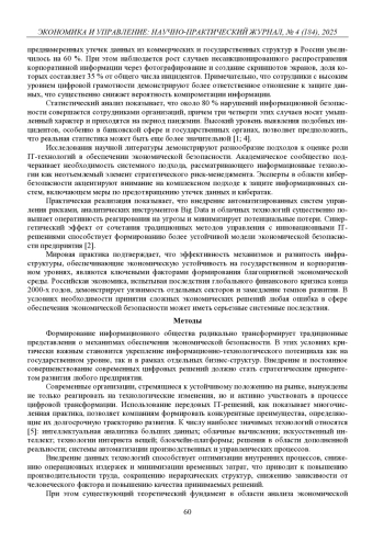Актуальность темы обусловлена тем, что в условиях цифровизации экономики вопросы обеспечения экономической безопасности организаций приобретают особую значимость. Развитие информационных технологий создает как новые возможности для защиты экономических интересов организаций, так и новые угрозы, требующие комплексного решения. Существующие методы обеспечения экономической безопасности нуждаются в модернизации с учетом растущего влияния цифровых технологий. Необходимо исследовать эффективность применения IT-решений для защиты экономических интересов предприятий в условиях цифровой трансформации экономики. Целью исследования является анализ возможностей использования IT-технологий для повышения уровня экономической безопасности организаций. Анализ современных тенденций показывает, что внедрение IT-технологий позволяет существенно повысить эффективность систем экономической безопасности