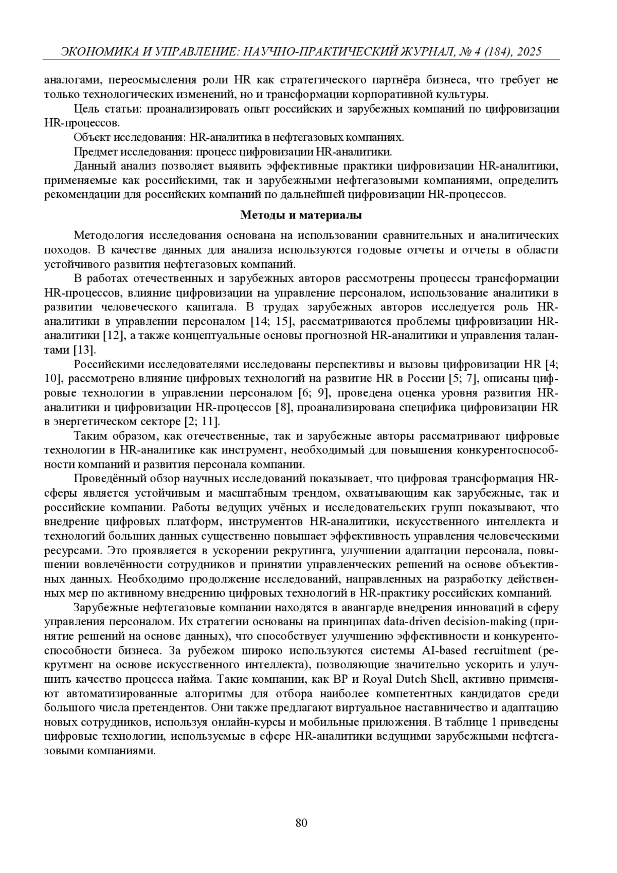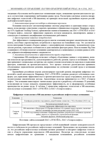 В условиях динамичного развития нефтегазовой отрасли, высокой конкуренции и кадрового дефицита эффективное управление персоналом становится одним из ключевых факторов устойчивого развития компаний. Цифровизация становится важным фактором конкурентоспособности современных организаций, особенно в такой капиталоемкой и технологически сложной сфере, как добыча и переработка нефти и газа. Современные технологии позволяют не только автоматизировать рутинные HR-процессы, но и принимать стратегические решения на основе анализа больших данных. HR-аналитика трансформируется из вспомогательной функции в инструмент, способный влиять на производственные и управленческие показатели. Важную роль при этом играют цифровые платформы, обеспечивающие сбор, хранение и интерпретацию информации о сотрудниках.