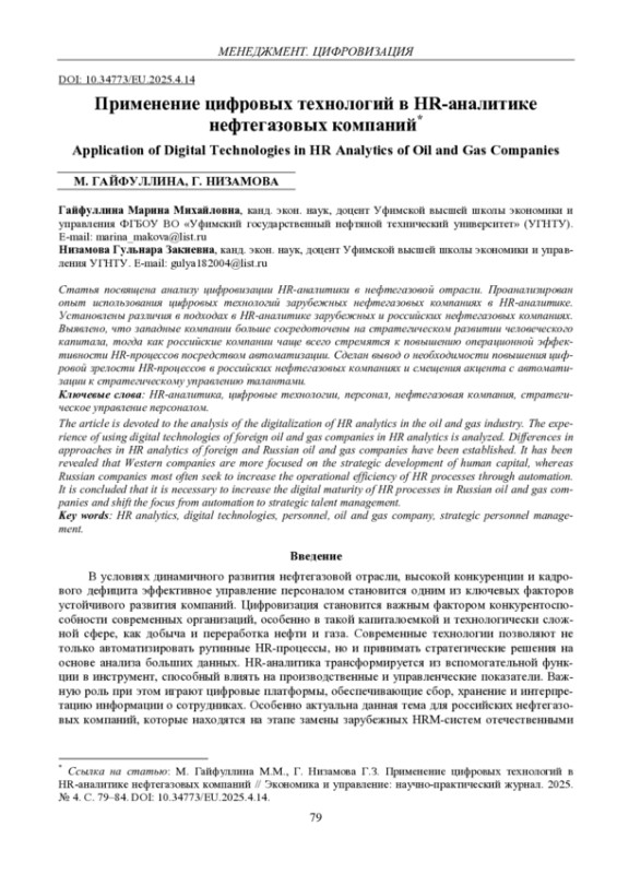Статья посвящена анализу цифровизации HR-аналитики в нефтегазовой отрасли. Проанализирован опыт использования цифровых технологий зарубежных нефтегазовых компаниях в НR-аналитике. Установлены различия в подходах в HR-аналитике зарубежных и российских нефтегазовых компаниях. Выявлено, что западные компании больше сосредоточены на стратегическом развитии человеческого капитала, тогда как российские компании чаще всего стремятся к повышению операционной эффективности HR-процессов посредством автоматизации. Сделан вывод о необходимости повышения цифровой зрелости HR-процессов в российских нефтегазовых компаниях и смещения акцента с автоматизации к стратегическому управлению талантами