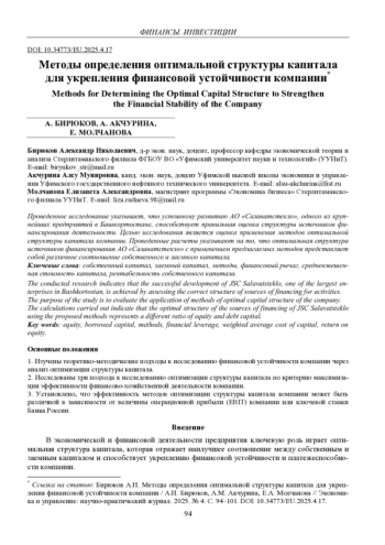 Проведенное исследование указывает, что успешному развитию АО «Салаватстекло», одного из крупнейших предприятий в Башкортостане, способствует правильная оценка структуры источников финансирования деятельности. Целью исследования является оценка применения методов оптимальной структуры капитала компании. Проведенные расчеты указывают на то, что оптимальная структура источников финансирования АО «Салаватстекло» с применением предлагаемых методов представляет собой различное соотношение собственного и заемного капитала