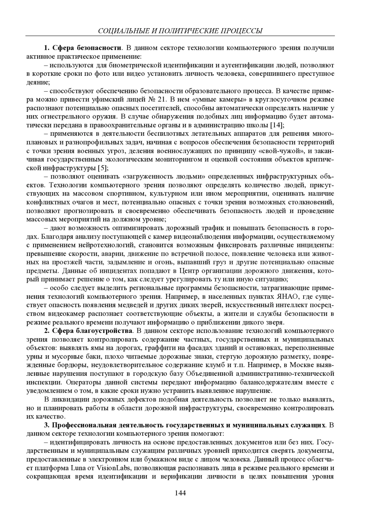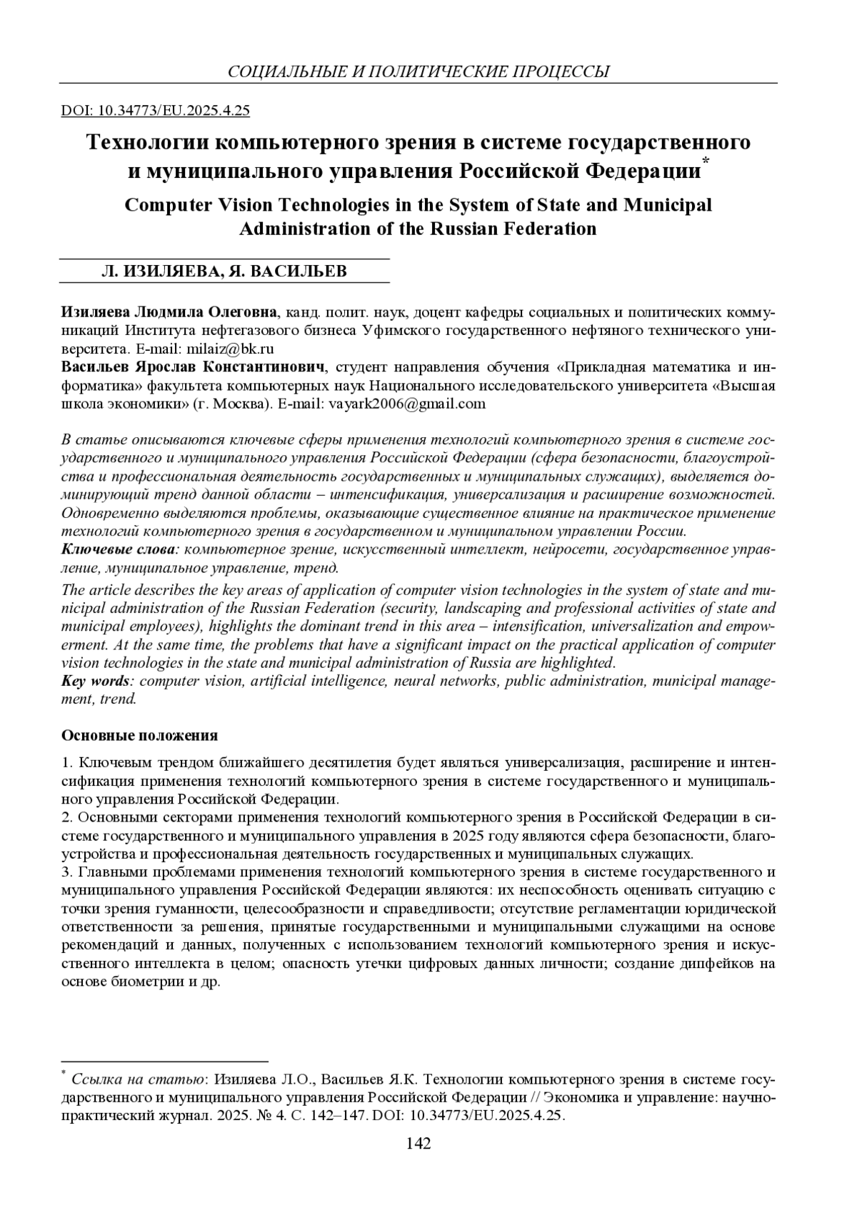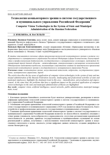 В статье описываются ключевые сферы применения технологий компьютерного зрения в системе государственного и муниципального управления Российской Федерации (сфера безопасности, благоустройства и профессиональная деятельность государственных и муниципальных служащих), выделяется доминирующий тренд данной области – интенсификация, универсализация и расширение возможностей. Одновременно выделяются проблемы, оказывающие существенное влияние на практическое применение технологий компьютерного зрения в государственном и муниципальном управлении России