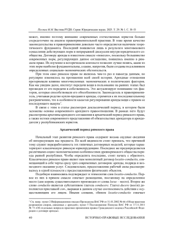 Современное гражданское право характеризуется появлением непоименованных и смешанных договорных типов. Это подталкивает правоприминителя к выявлению характеристик, на основе которых возможна классификация договоров для обеспечения нормативной определенности. Подобное положение дел имеет место при разграничении договора аренды от иных соглашений, связанных с передачей имущества на определенный срок. Данная потребность впервые возникла еще в древнеримском праве. Цель состоит в проведении исторического исследования с выявлением конкретных предпосылок, обусловивших обособление договора найма в Древнем Риме. Использован историко-филологический, систематический и телеологический методы экзегезы античных текстов. Полученные результаты показывают, что первоначальной формой арендных отношений являлась временная продажа объекта найма. Источники свидетельствуют о применении данной формы для использования труда подвластного лица, а также при эксплуатации общественной земли. В период Римской республики арендное правоотношение постепенно начинает обособляться от купли-продажи. Попытки систематизации римского права I в. до н. э. уже разделяют два договора между собой. В этот же период юрист Сервий Сульпиций Руф через учение о непреодолимой силе конкретизирует обязательство арендодателя, определяя сферу его риска и основания для вычета и возврата арендных платежей. Из этого следует вывод, что распределение риска между сторонами способствовало определению границ обязательств локатора и кондуктора, которые с этого момента приобрели самостоятельный характер.