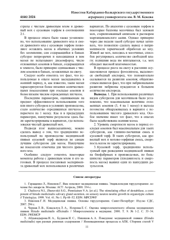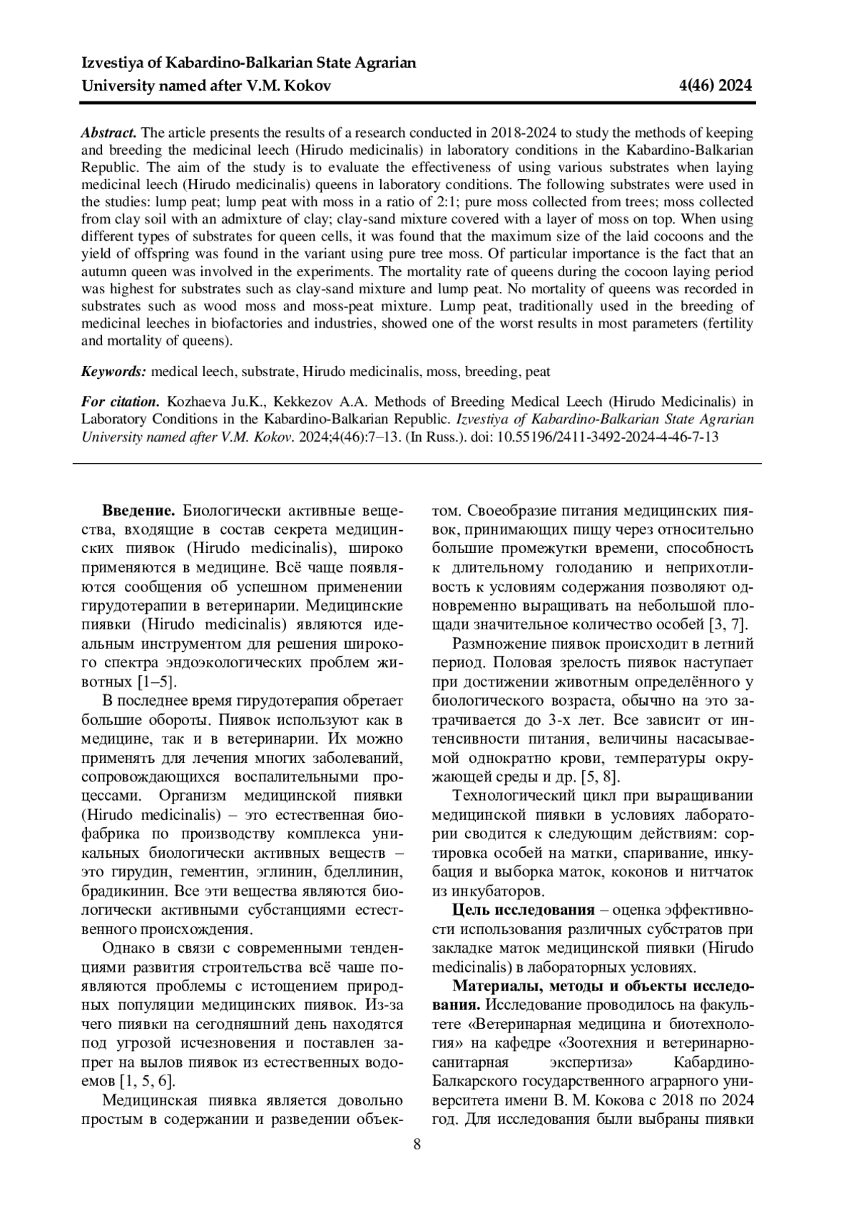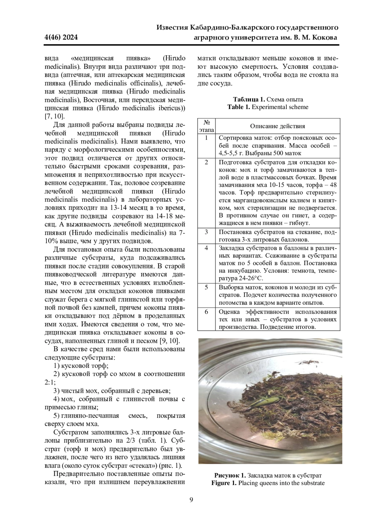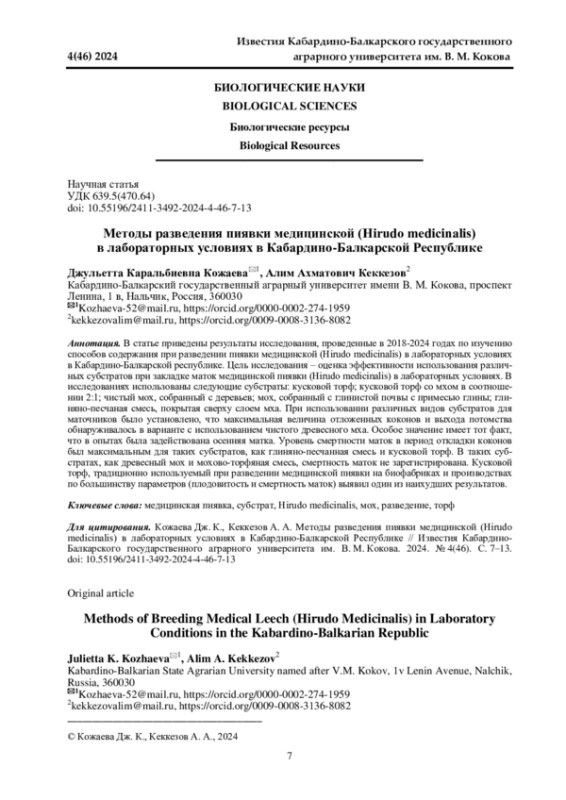 В статье приведены результаты исследования, проведенные в 2018-2024 годах по изучению способов содержания при разведении пиявки медицинской (Hirudo medicinalis) в лабораторных условиях в Кабардино-Балкарской республике. Цель исследования - оценка эффективности использования различных субстратов при закладке маток медицинской пиявки (Hirudo medicinalis) в лабораторных условиях. В исследованиях использованы следующие субстраты: кусковой торф; кусковой торф со мхом в соотношении 2:1; чистый мох, собранный с деревьев; мох, собранный с глинистой почвы с примесью глины; глиняно-песчаная смесь, покрытая сверху слоем мха. При использовании различных видов субстратов для маточников было установлено, что максимальная величина отложенных коконов и выхода потомства обнаруживалось в варианте с использованием чистого древесного мха. Особое значение имеет тот факт, что в опытах была задействована осенняя матка. Уровень смертности маток в период откладки коконов был максимальным для таких субстратов, как глиняно-песчанная смесь и кусковой торф. В таких субстратах, как древесный мох и мохово-торфяная смесь, смертность маток не зарегистрирована. Кусковой торф, традиционно используемый при разведении медицинской пиявки на биофабриках и производствах по большинству параметров (плодовитость и смертность маток) выявил один из наихудших результатов.