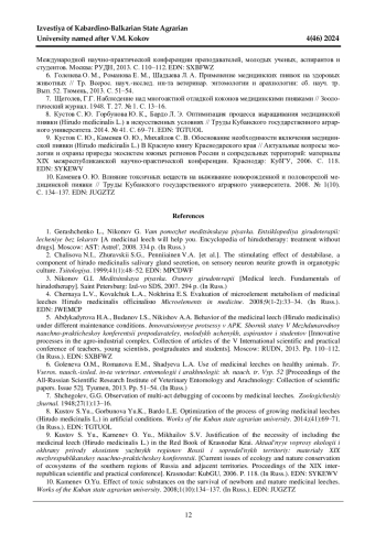 8. 	Кустов С. Ю. Горбунова Ю. К., Бардо Л. Э. Оптимизация процесса выращивания медицинской пиявки (Hirudo medicinalis L.) в искусственных условиях // Труды Кубанского государственного аграрного университета. 2014. № 41. С. 69-71. EDN: TGTUOL